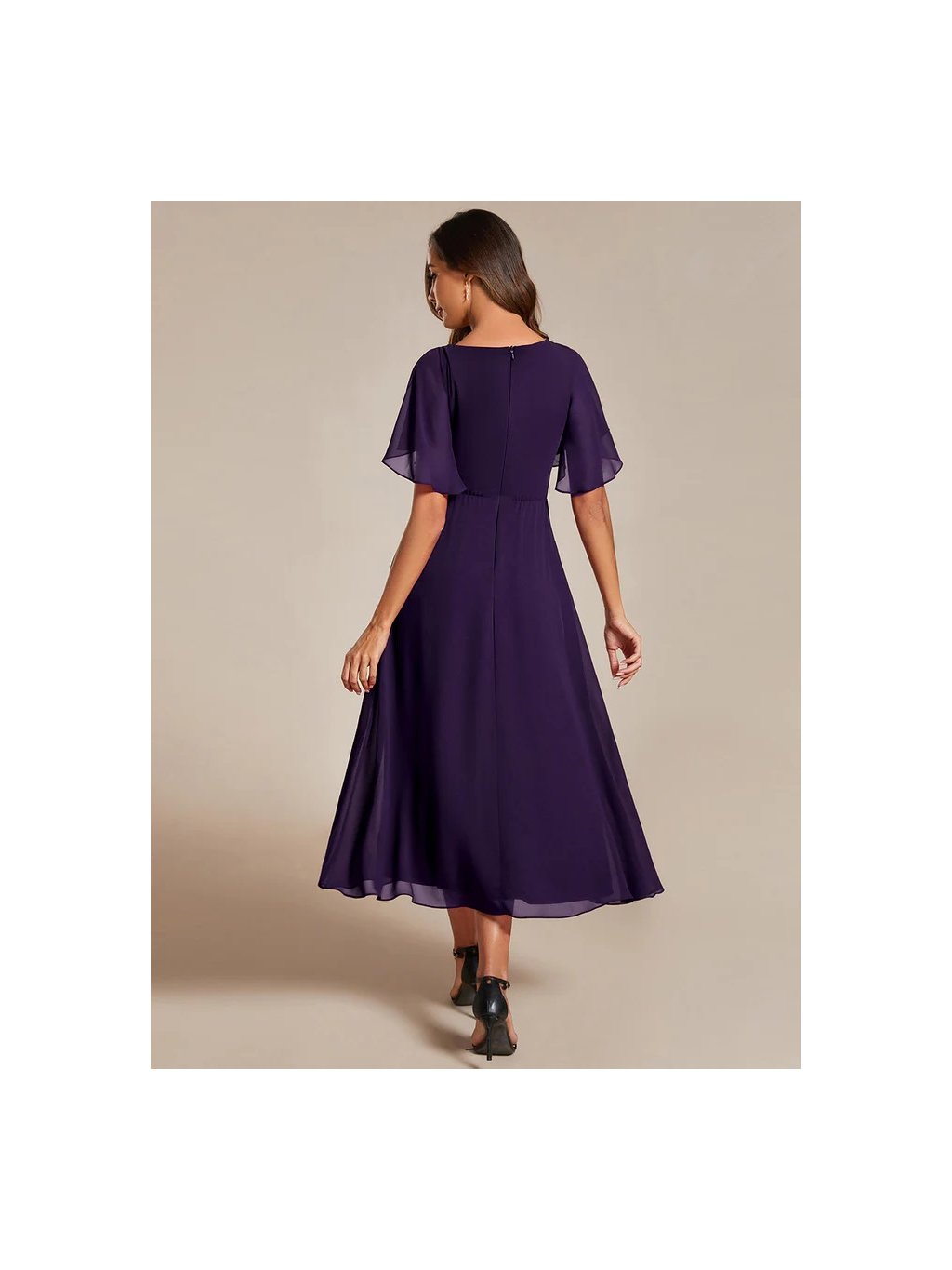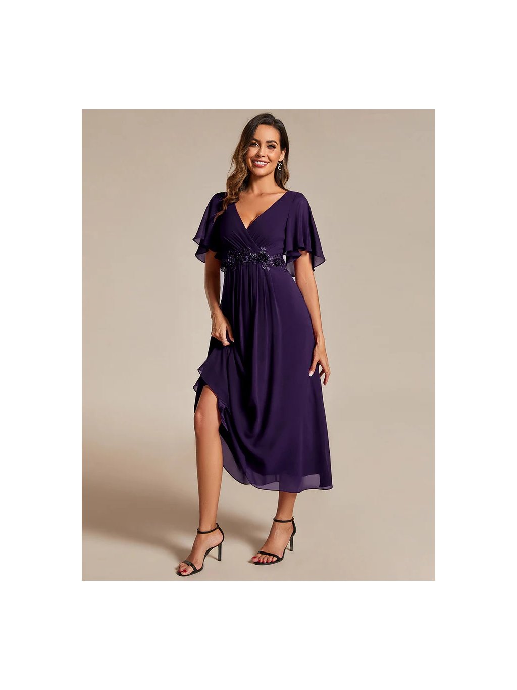Jemné šifonové šaty s krátkými rukávy, dokonalý jednoduchý design. Šaty mají délku sukně ke kotníkům, Elegantní rukávky a krásnou výšivku v květinovém designu.