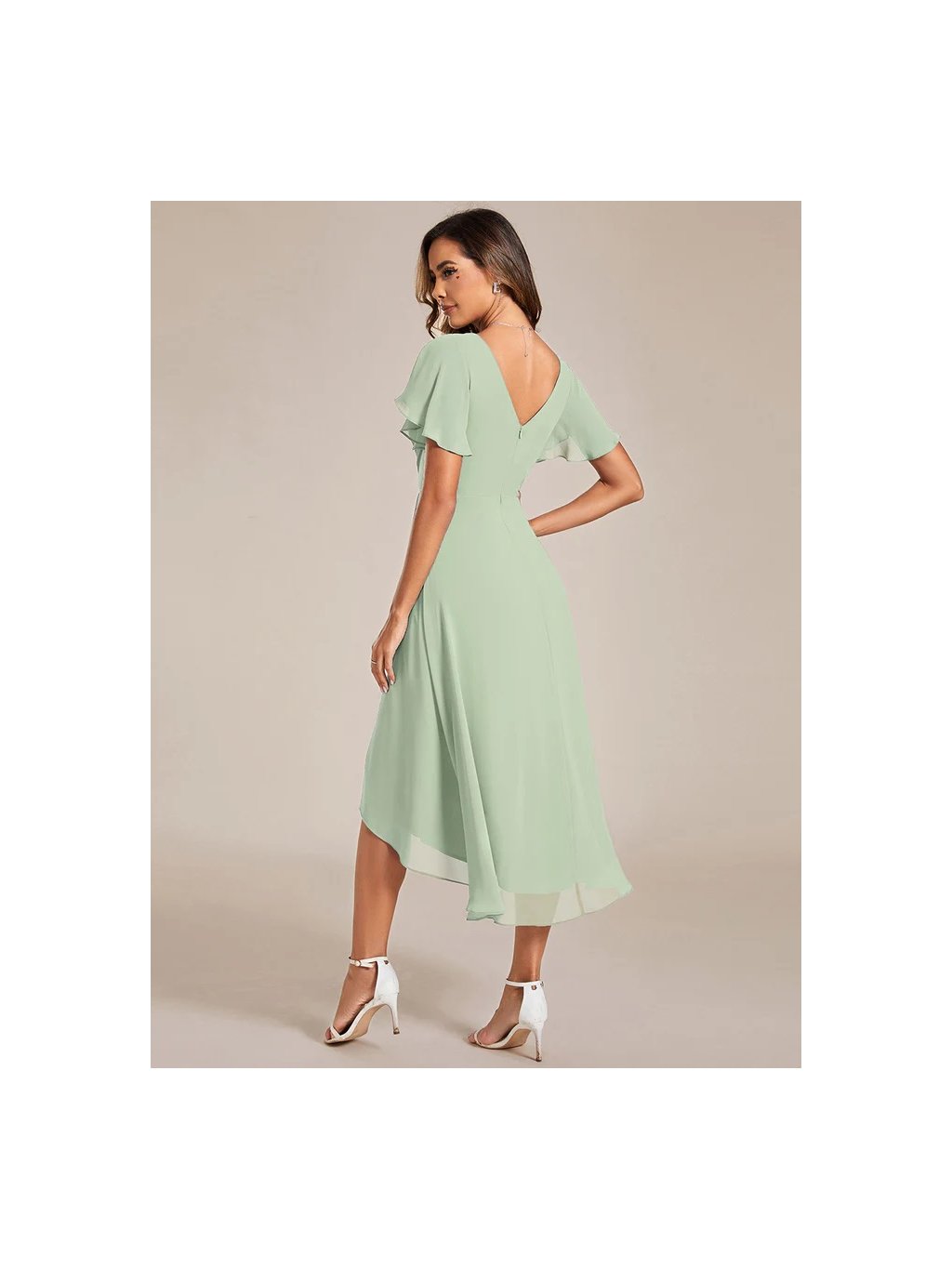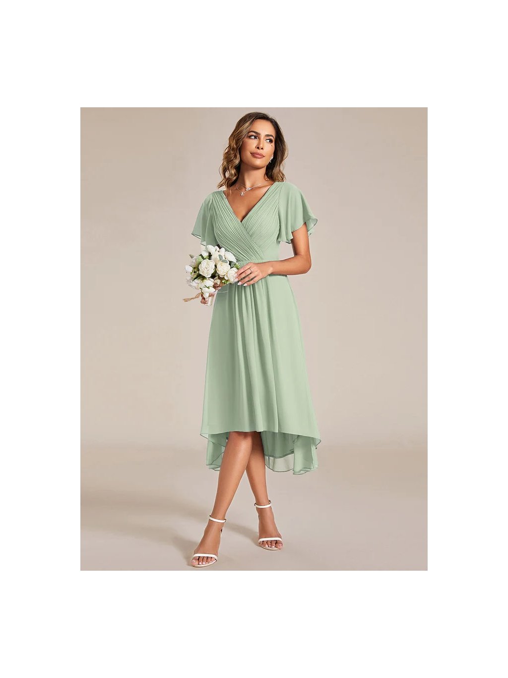 Jemné šifonové šaty s krátkými rukávy, dokonalý jednoduchý design. Šaty mají midi délku a asymetrickou sukni, ideální pro svatební hosty či družičky.