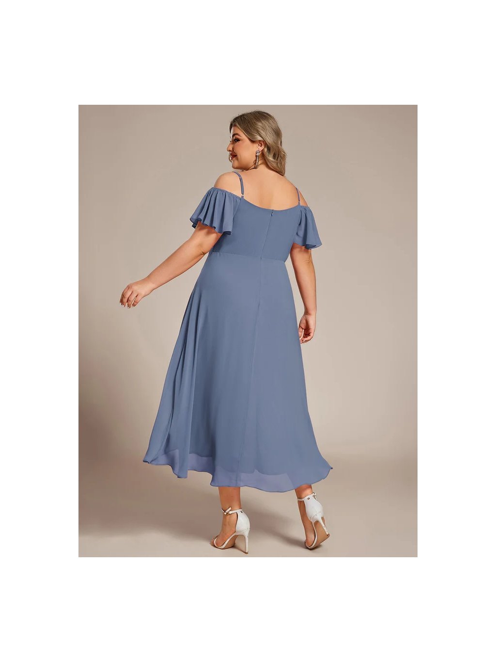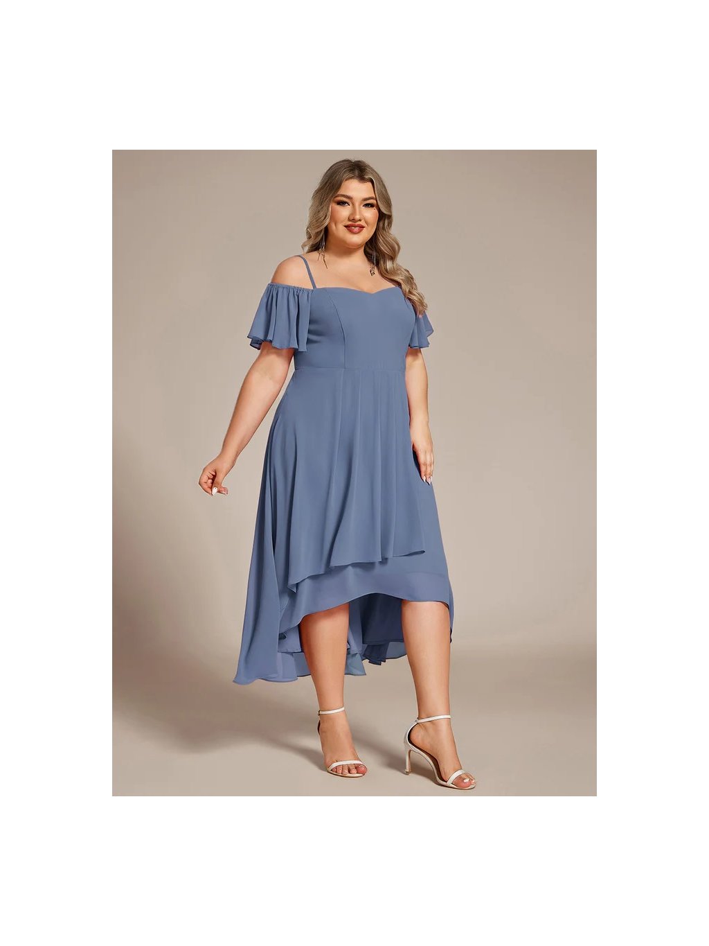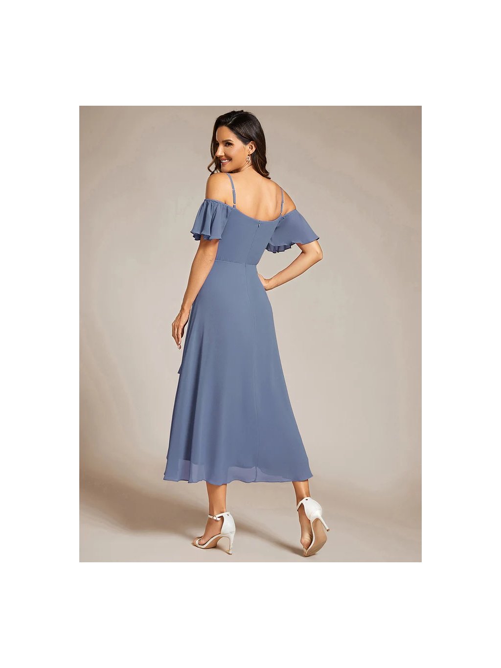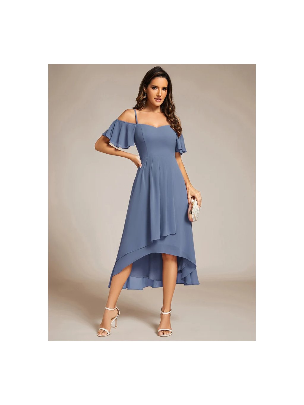 Luxusní šaty na ples či společenské akce. Mírně pružný a pevný materiál. Špagetová ramínka a spadlá silnější. Šatičky mají velmi pěkný výstřih. Podprsenka není vložena. Šaty v délce midi s asymetrickou sukní.