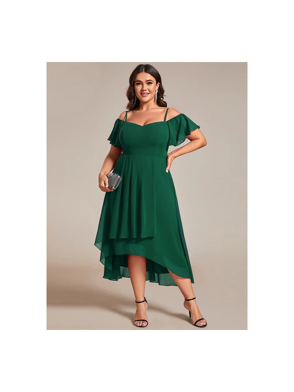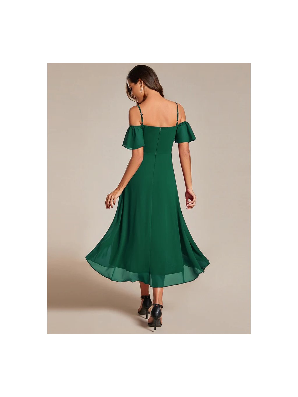 Luxusní šaty na ples či společenské akce. Mírně pružný a pevný materiál. Špagetová ramínka a spadlá silnější. Šatičky mají velmi pěkný výstřih. Podprsenka není vložena. Šaty v délce midi s asymetrickou sukní.