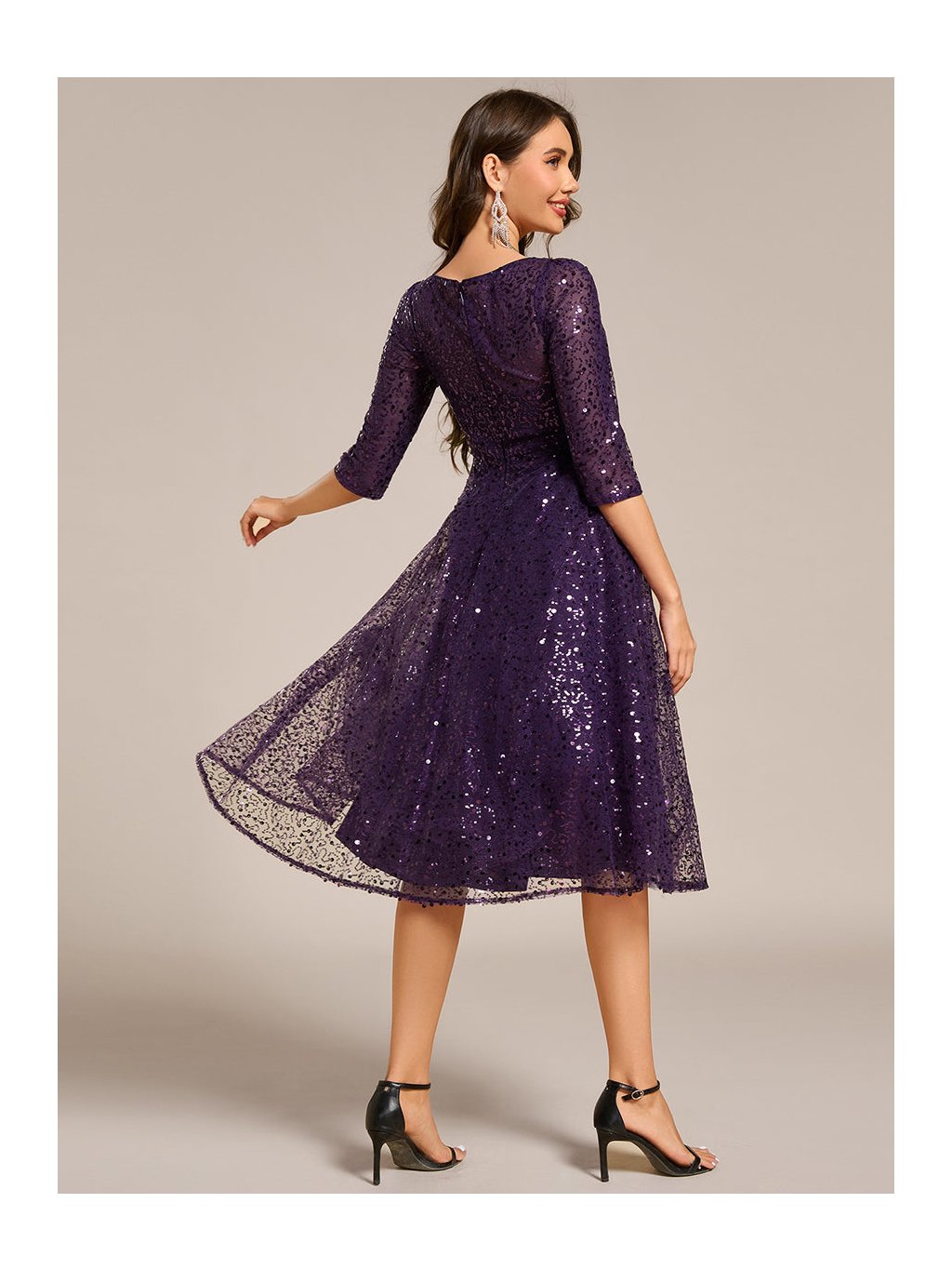 Krásné lesklé šaty s flitry v midi délce ,s třičtvrtečním rukávem ,lodičkový výstřih na zádech skrytý zip.
