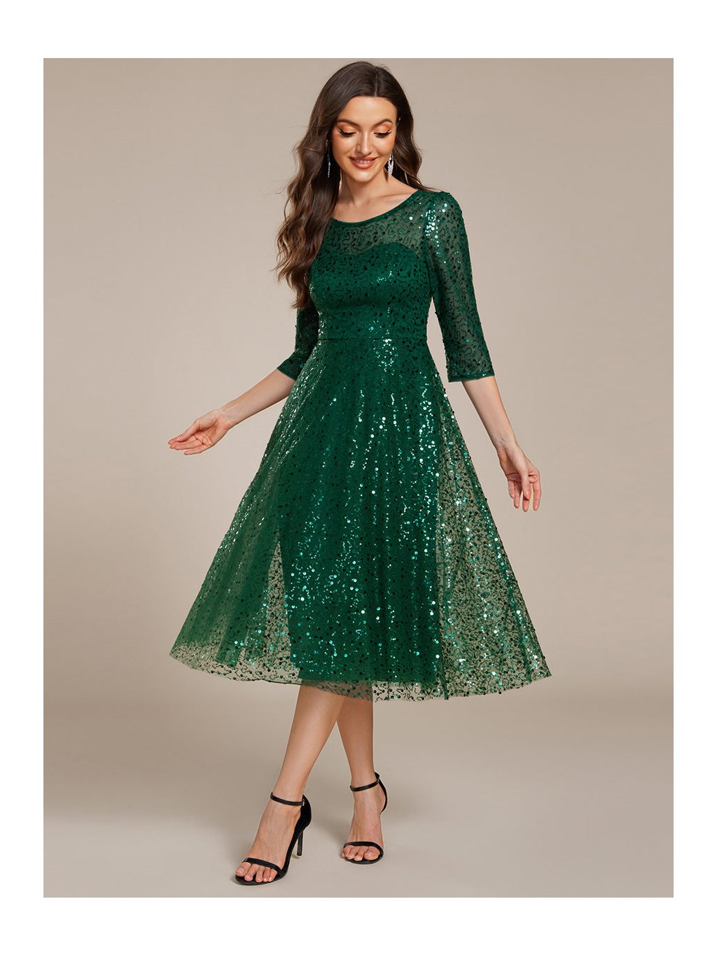 Krásné lesklé šaty s flitry v midi délce ,s třičtvrtečním rukávem ,lodičkový výstřih na zádech skrytý zip.