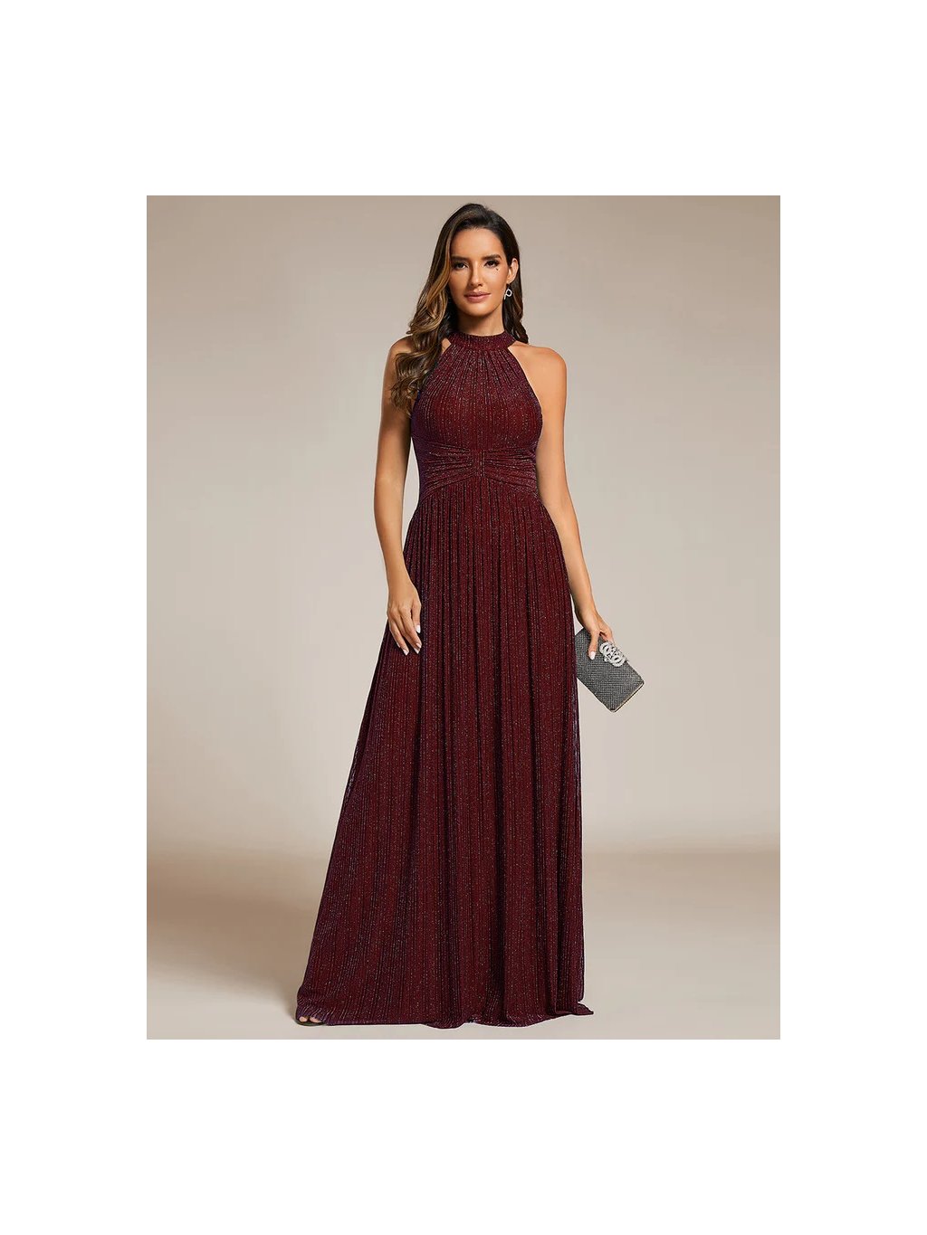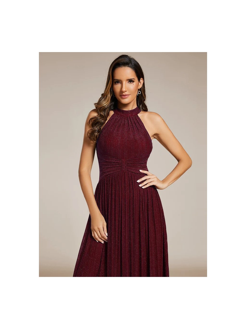 Šaty bordové dlouhé třpytivé s ohlávkovým výstřihem , v zadu zapínání až ke krku, bez rukávů. V pase jsou skládané což jim dává zvláštní tvar.