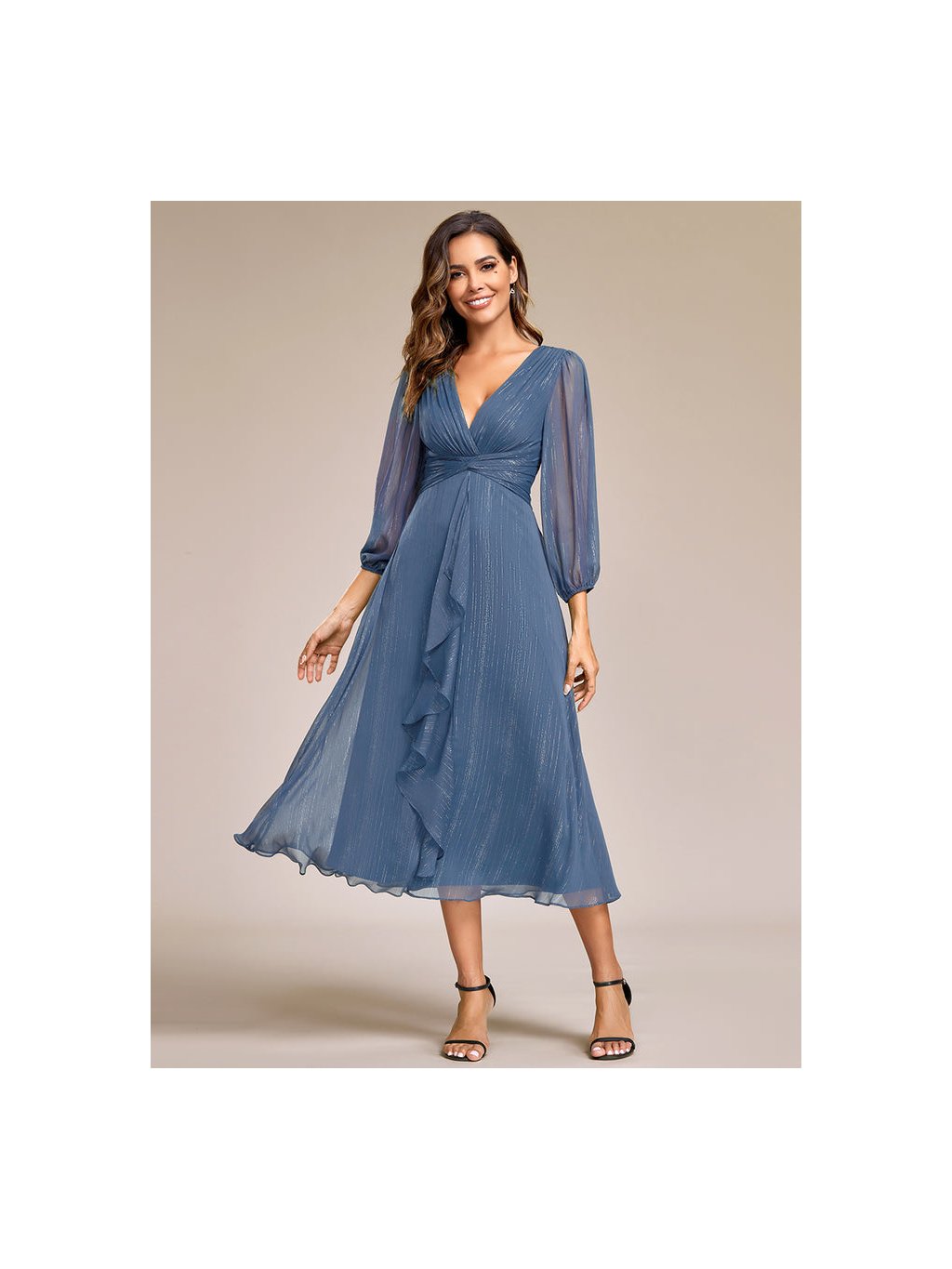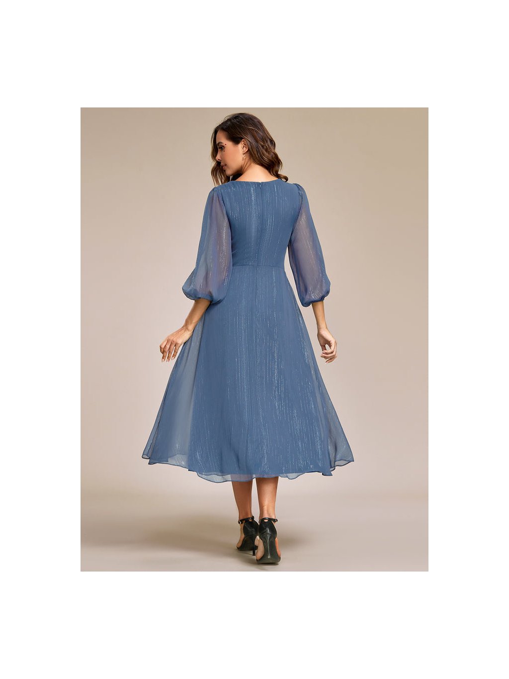 Šaty světlé šedomodré střední délky s dlouhými rukávy. V pase mají mírné řasení. Nemají vystužení prsou. Vzadu na zip. Šifonová látka prošitá jemnou stříbrnou nitkou.