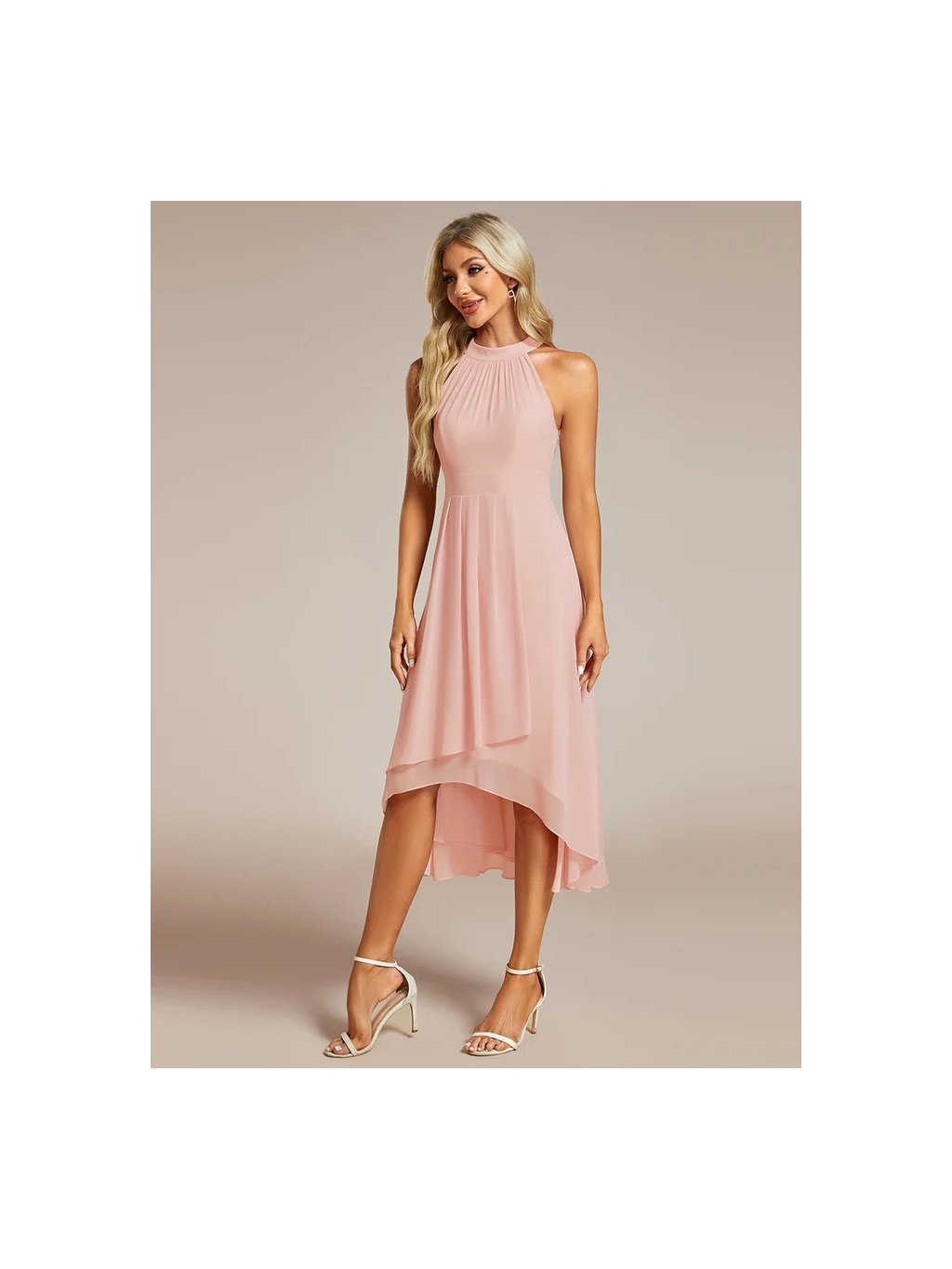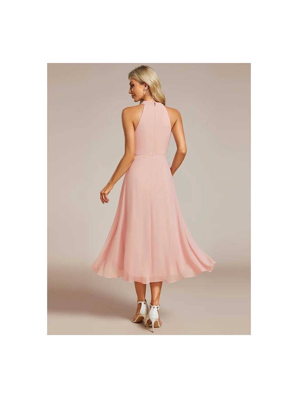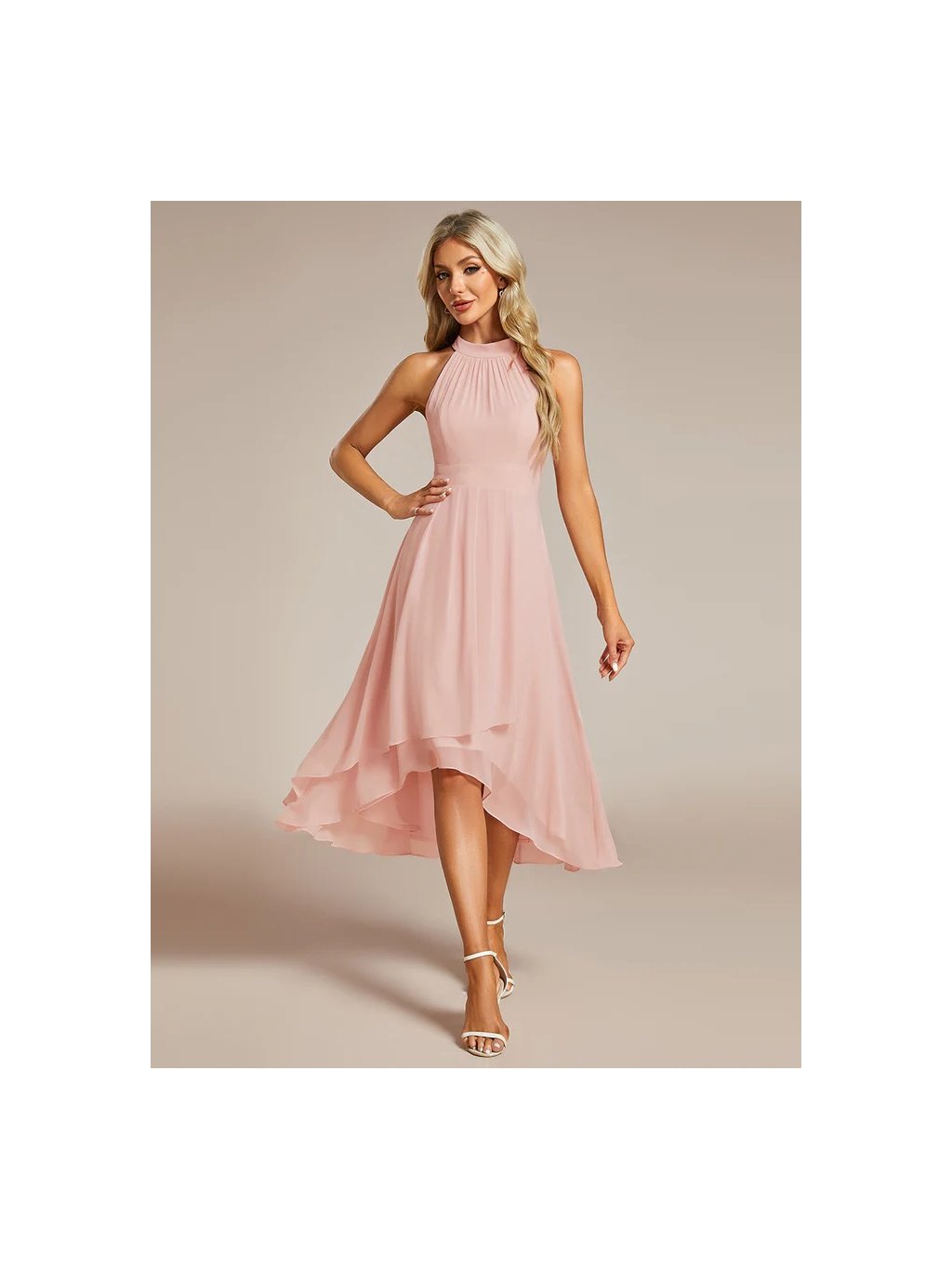 Šaty růžové střední délky s ohlávkovým výstřihem , v zadu zapínání až ke krku, bez rukávů. V pase jsou skládané což jim dává zvláštní tvar.