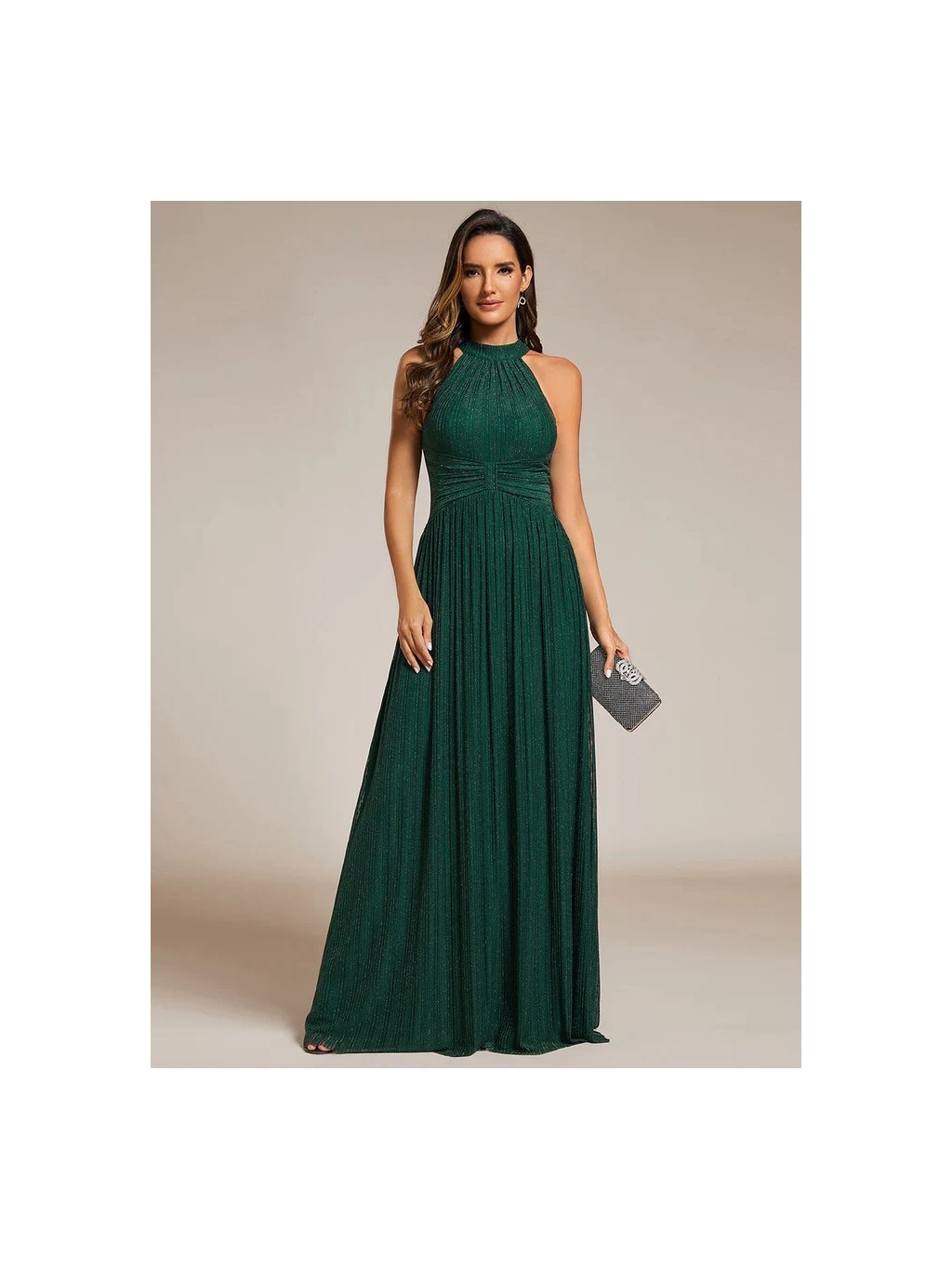 Dlouhé zelené třpytivé šaty s ohlávkovým výstřihem , v zadu zapínání až ke krku, bez rukávů. V pase jsou skládané což jim dává zvláštní tvar.