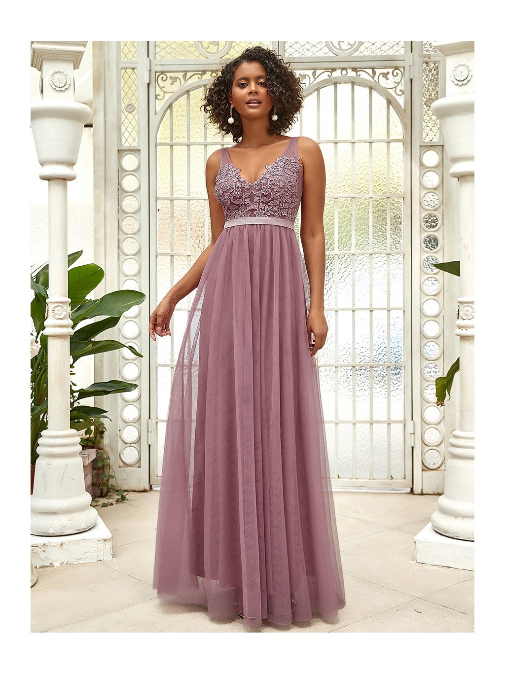 Luxusní orchyd dlouhé šaty Ever Pretty. Šatičky jsou na široká ramínka, na prsou i zádech je velký výstřih. Celé šaty jsou z tylu. Vrchní část je zdobená výšivkou, která částečně postupuje do sukně. Zároveň je vrchní díl lehce průsvitný, sukně je podšitá.