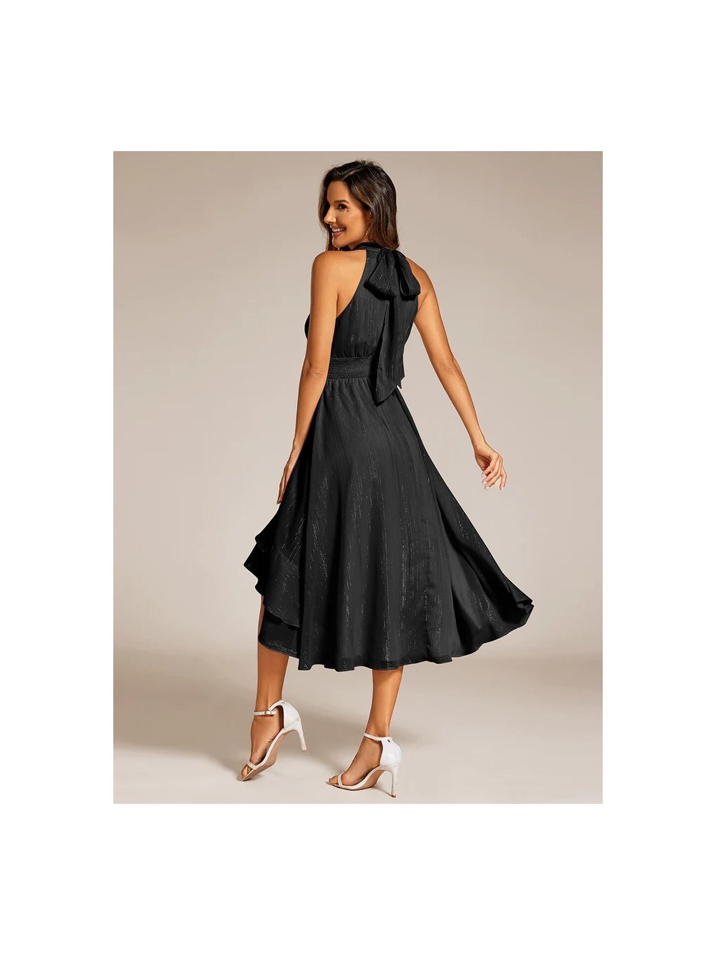 Šaty černé střední délky s ohlávkovým výstřihem , v zadu zapínání až ke krkus velkou mašlí, bez rukávů. Dole na šatech je široký lem který jim dává bohatost.