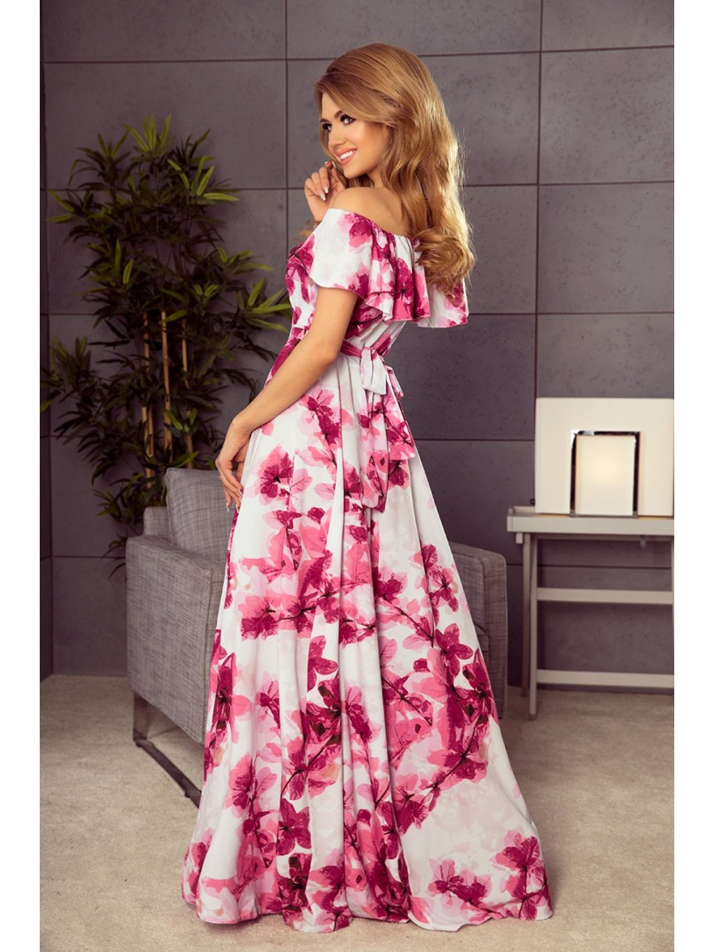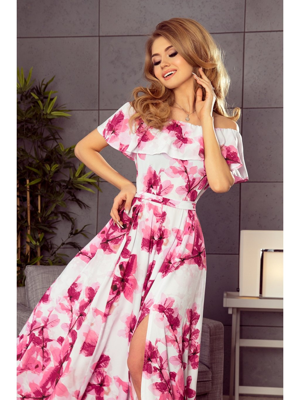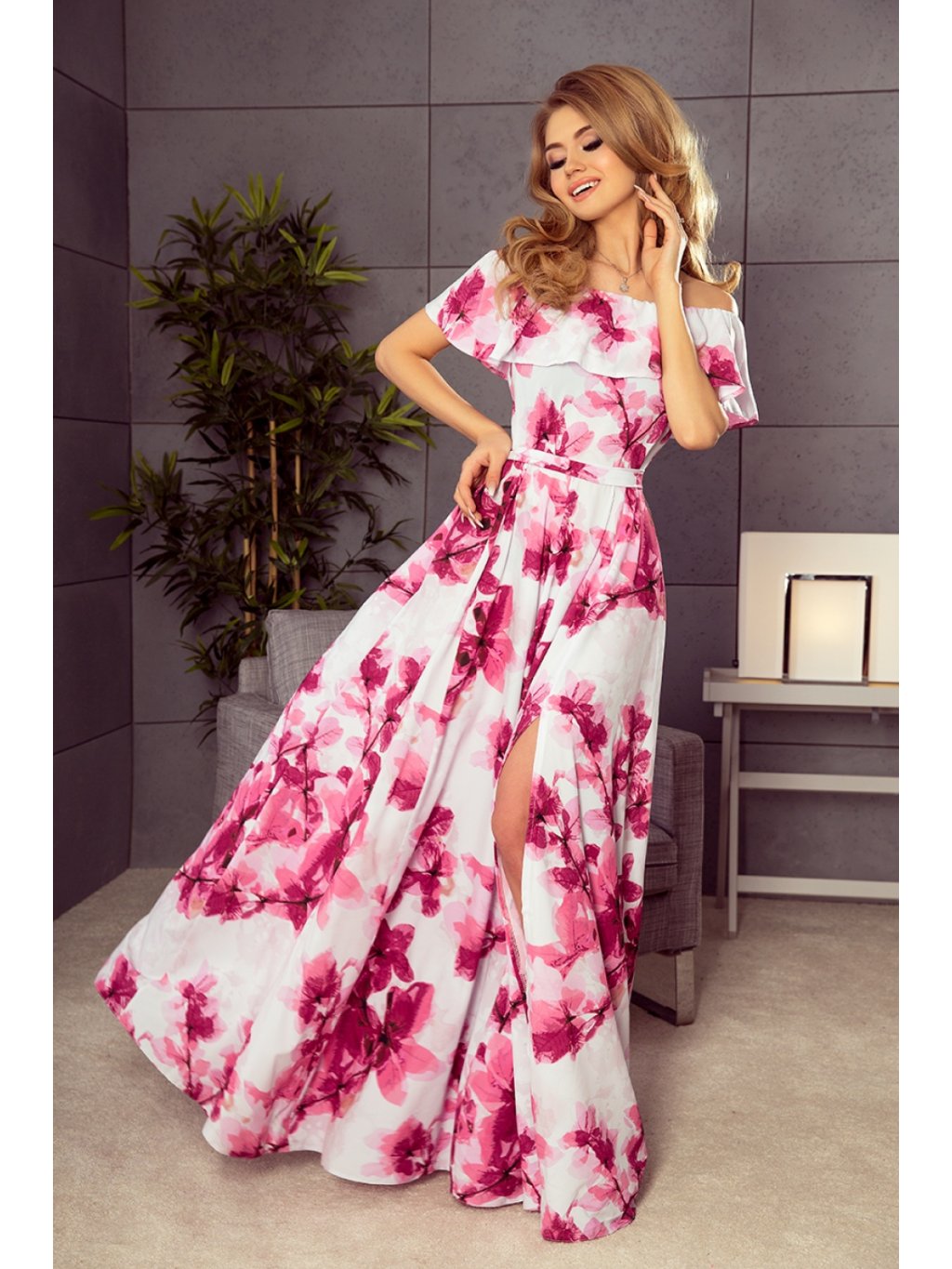 Dlouhé nařasené šaty s velkými růžovými květy na bílém pozadí. Značka numoco. Skvěle se hodí pro mnoho příležitostí.