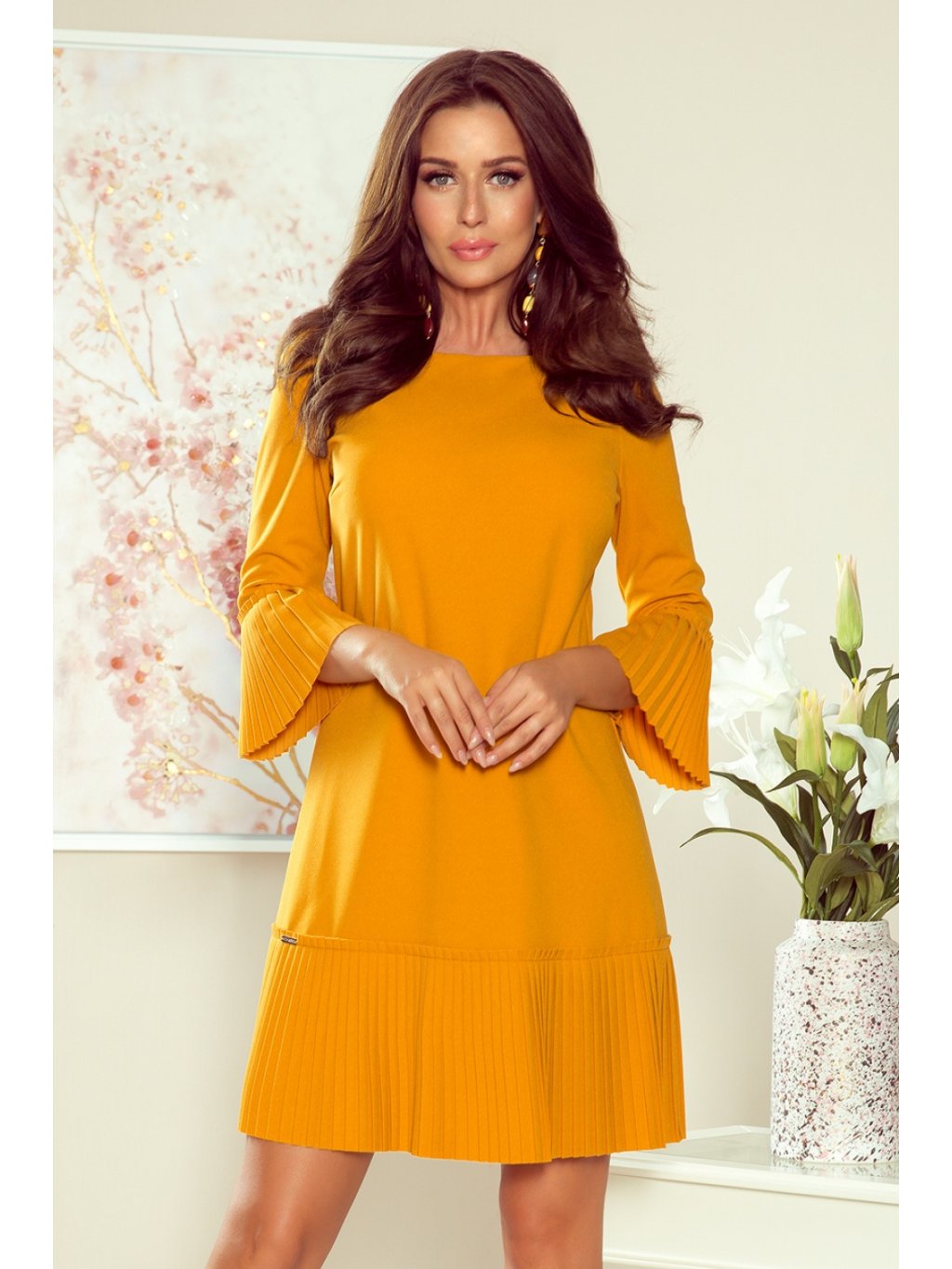 Krásné a skromné šaty v hořčicové barvě s jemnými záhyby na rukávech a sukni. Značka numoco.