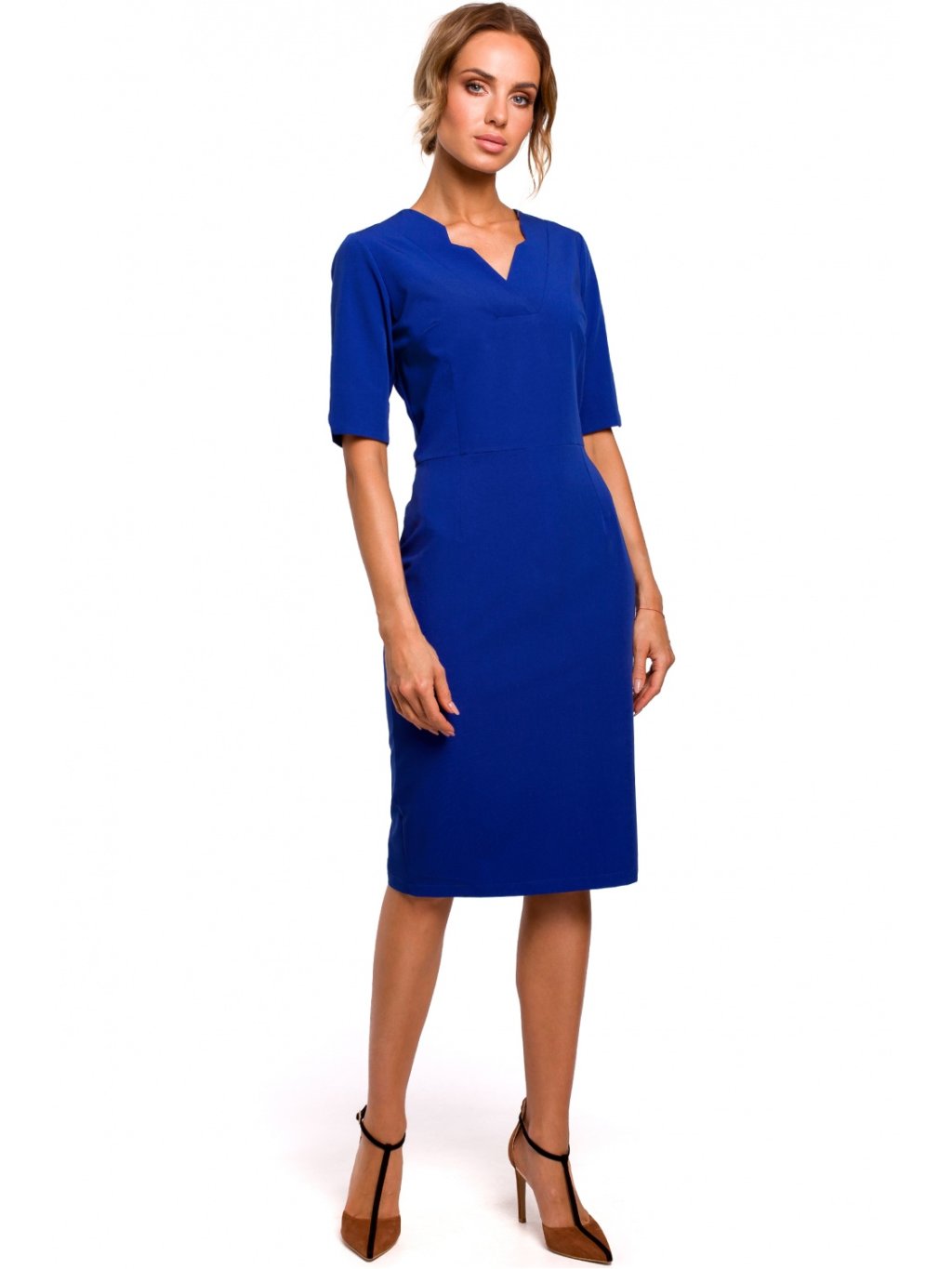 Jemné a elegantní tužkové šaty se zvýšenou linií pasu a výstřihem do V s průstřihy. Šaty s krátkými rukávy, zapínané na krytý zip. Šaty bez podšívky. Jemný kancelářský styl v té nejlepší podobě.