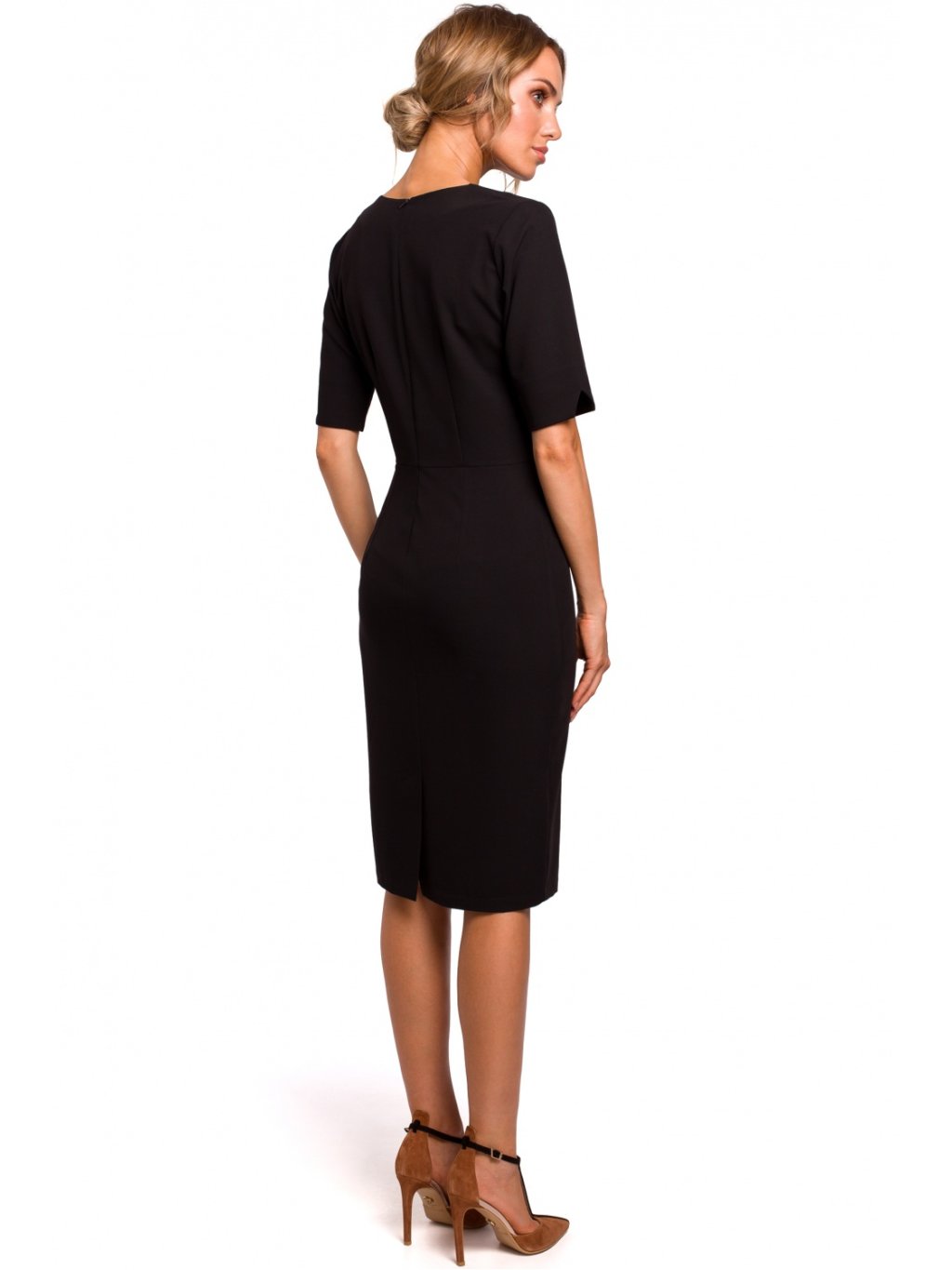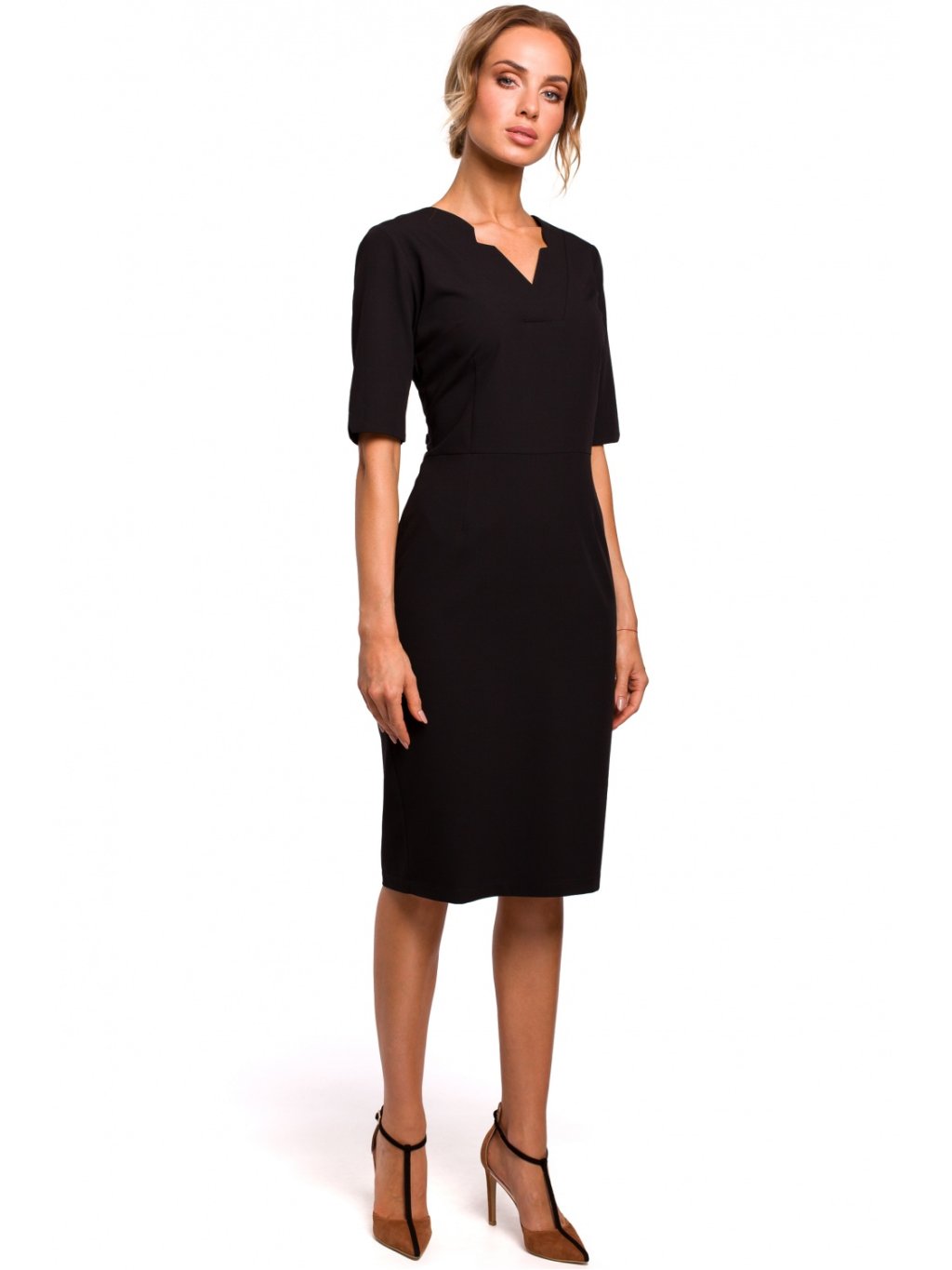 Jemné a elegantní tužkové šaty se zvýšenou linií pasu a výstřihem do V s průstřihy. Šaty s krátkými rukávy, zapínané na krytý zip. Šaty bez podšívky. Jemný kancelářský styl v té nejlepší podobě.