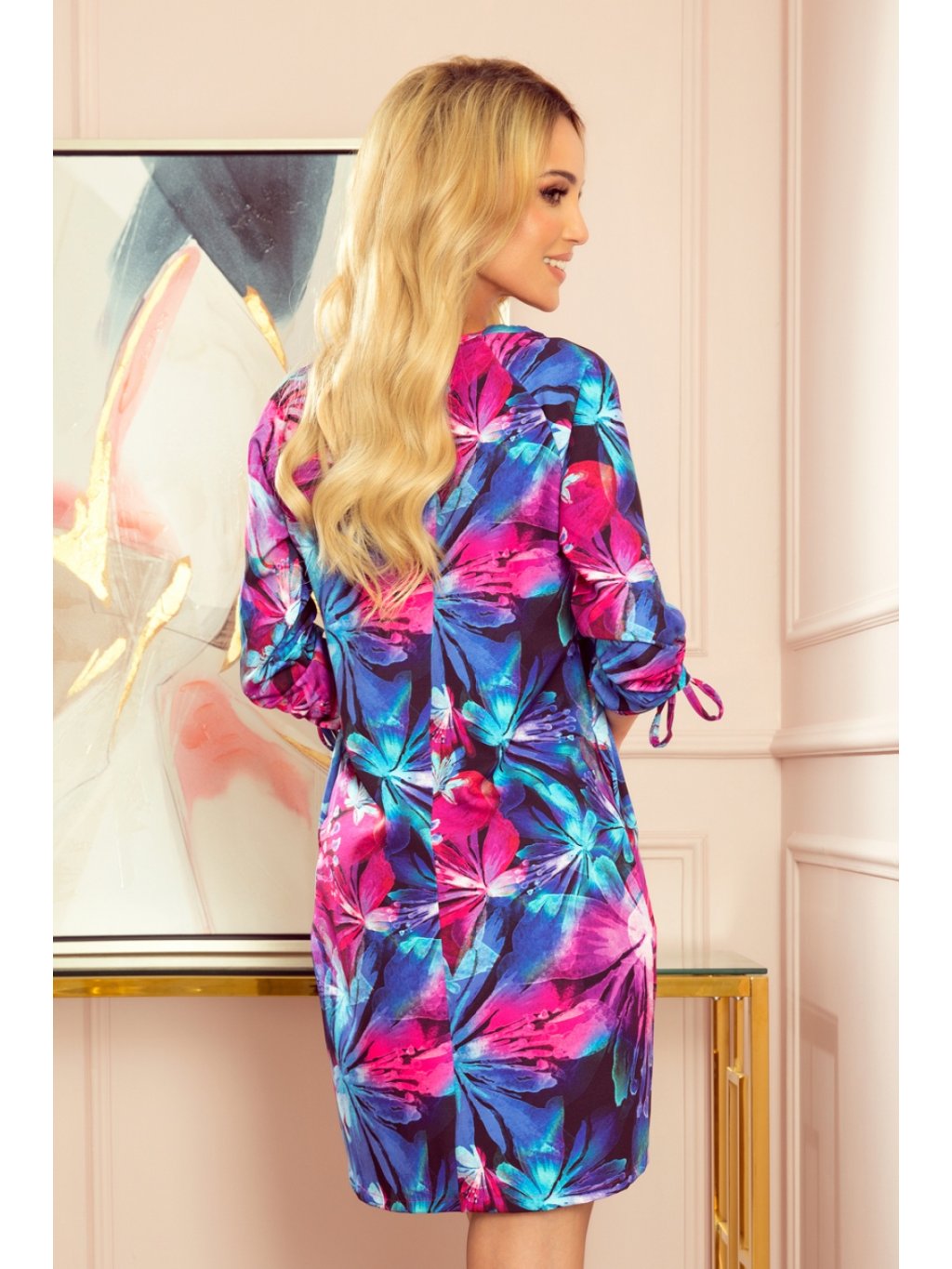 Pohodlné oversize šaty se zavazováním na rukávech. Vzorované modrými a růžovými velkými květy. Značka numoco. Vyrobeno v Polsku.