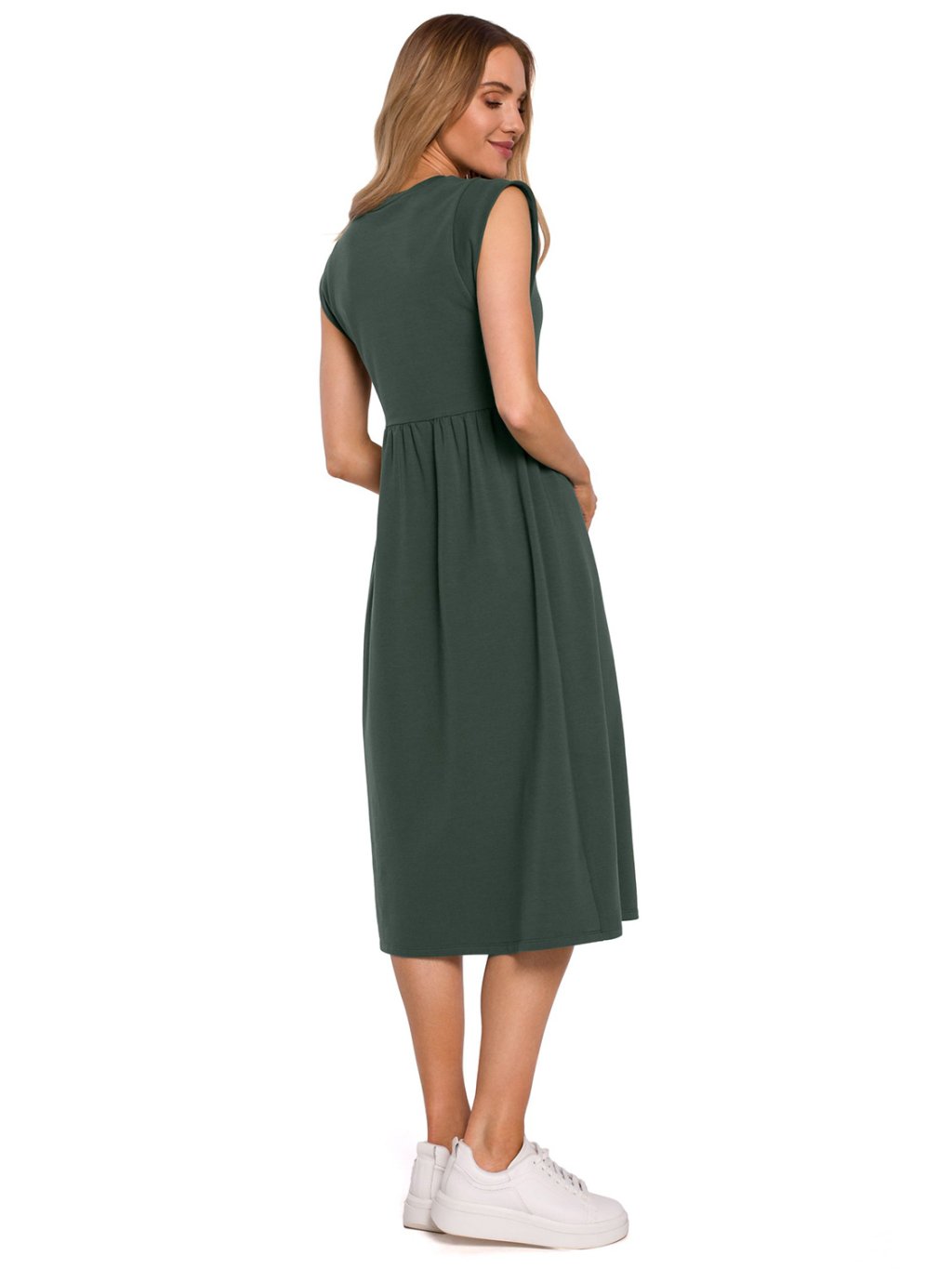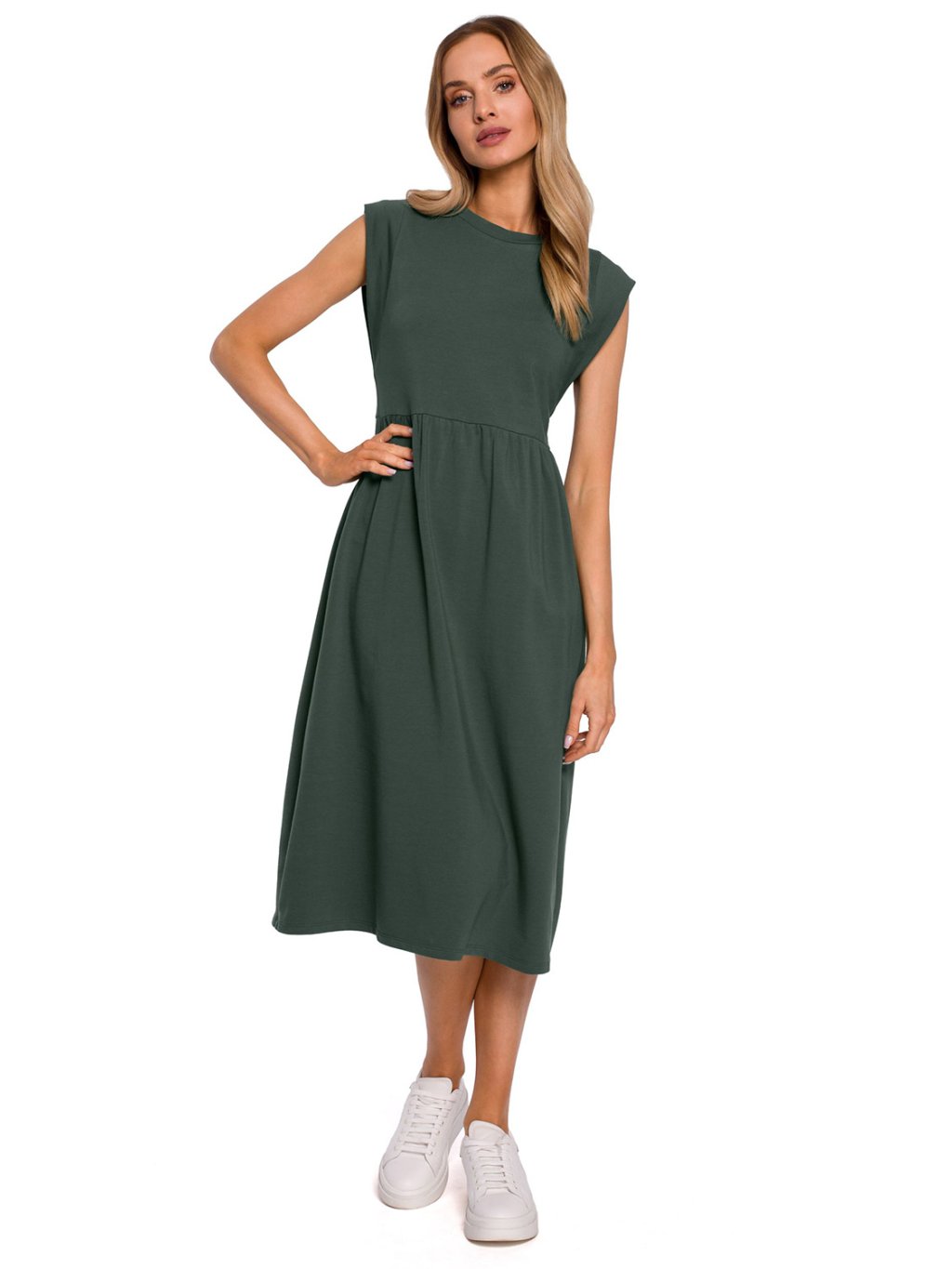 Pletené šaty v délce midi. Střih s vysokým pasem a volnou sukní opticky zužuje pas a díky rovnému střihu navíc zeštíhluje celou siluetu. Má charakteristické, velmi krátké rukávy a vestavěný výstřih. Šaty jsou ideální pro každodenní nošení i jako společenské šaty.
