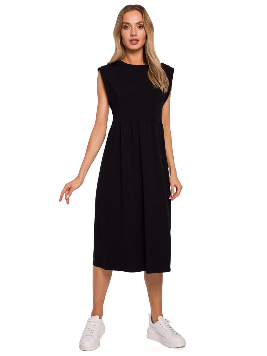 Pletené šaty v délce midi. Střih s vysokým pasem a volnou sukní opticky zužuje pas a díky rovnému střihu navíc zeštíhluje celou siluetu. Má charakteristické, velmi krátké rukávy a vestavěný výstřih. Šaty jsou ideální pro každodenní nošení i jako společenské šaty.