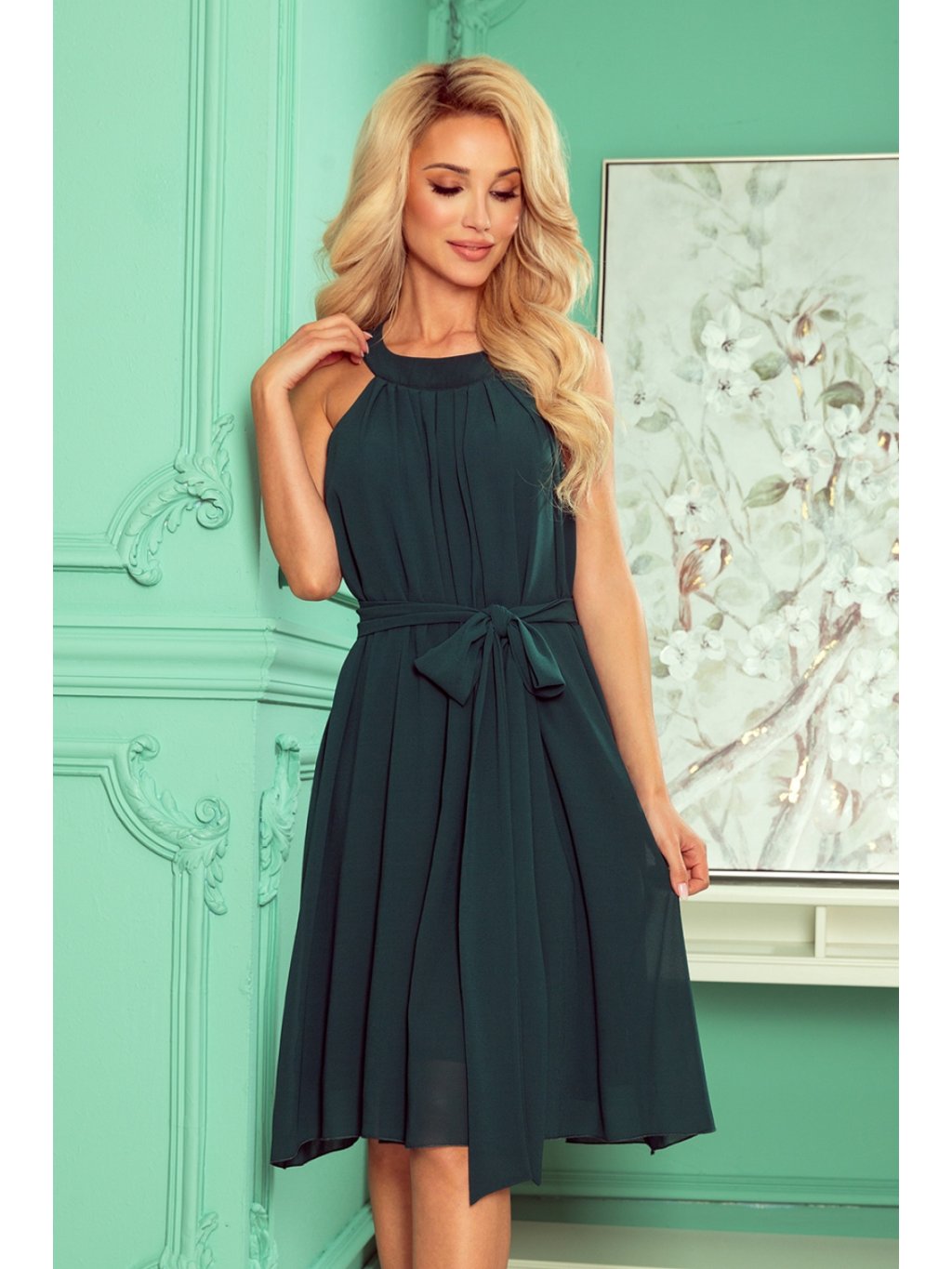 Šifonové šaty Alizee s páskem a zavazováním na zádech. Šaty v lahvově zelené barvě. Značka numoco. Vyrobeno v Polsku.