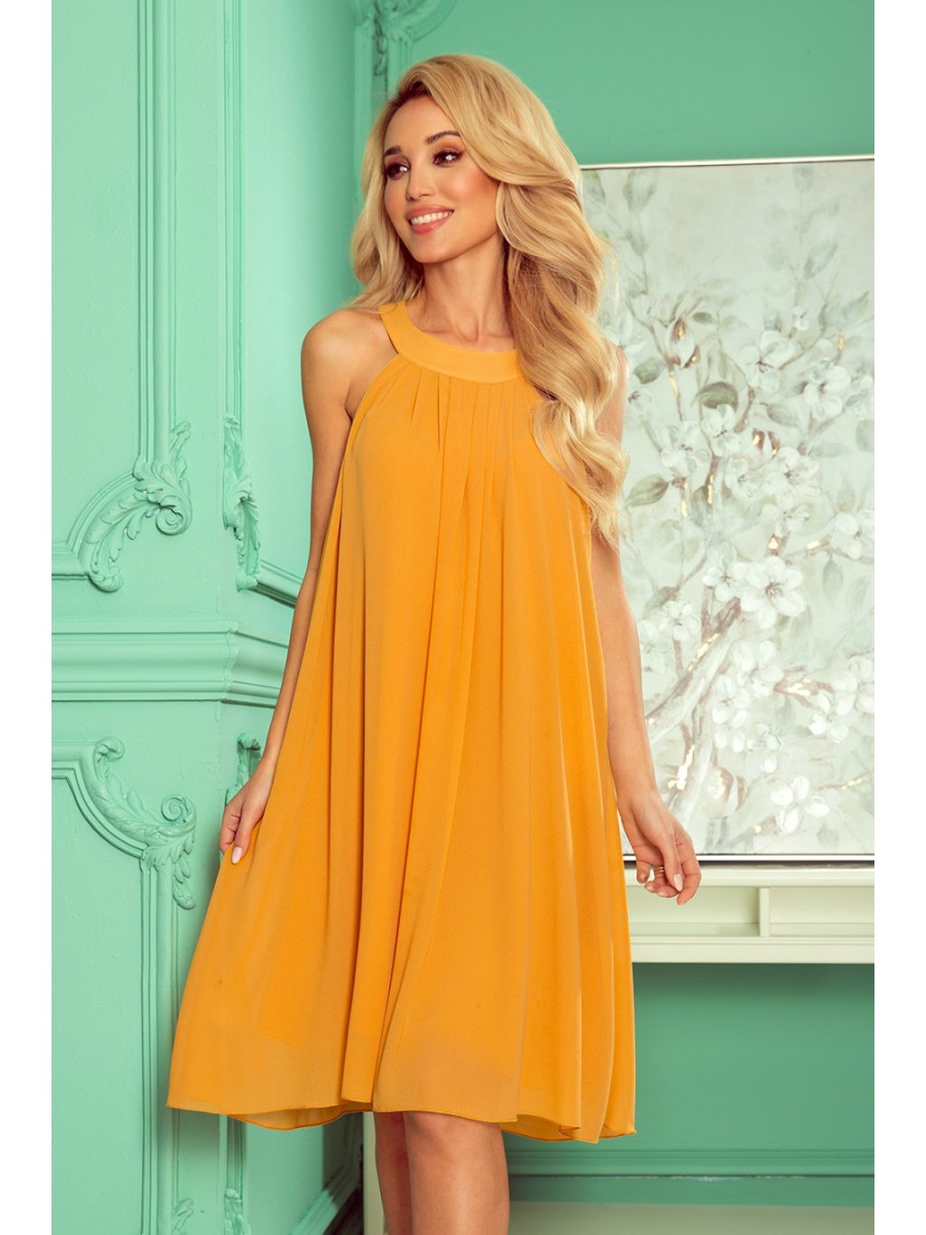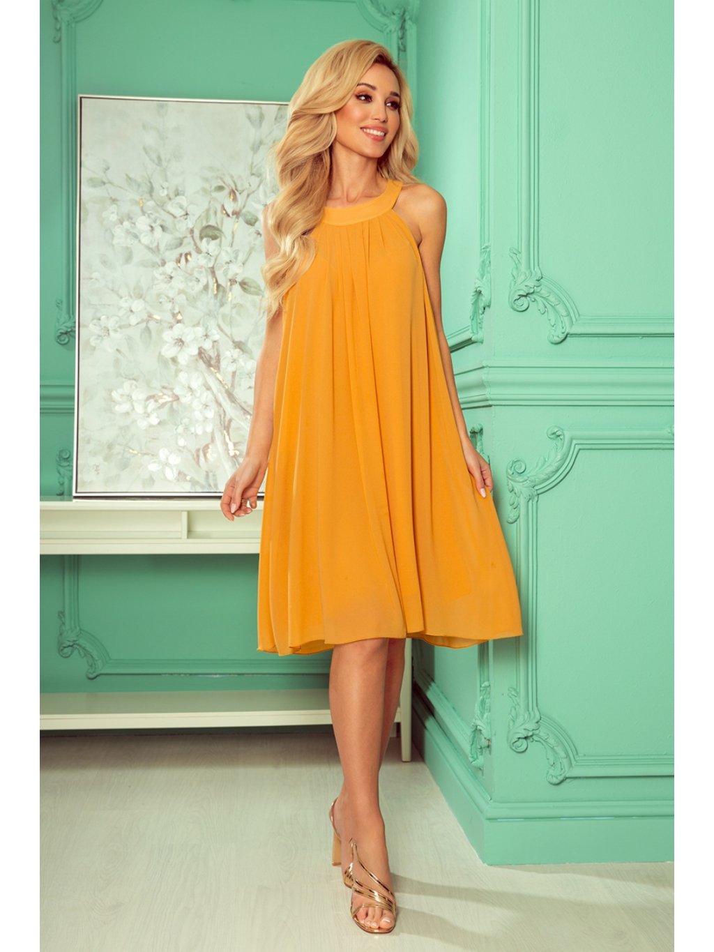 Šifonové šaty s páskem a zavazováním na zádech. Šaty v medové barvě. Značka numoco. Vyrobeno v Polsku.