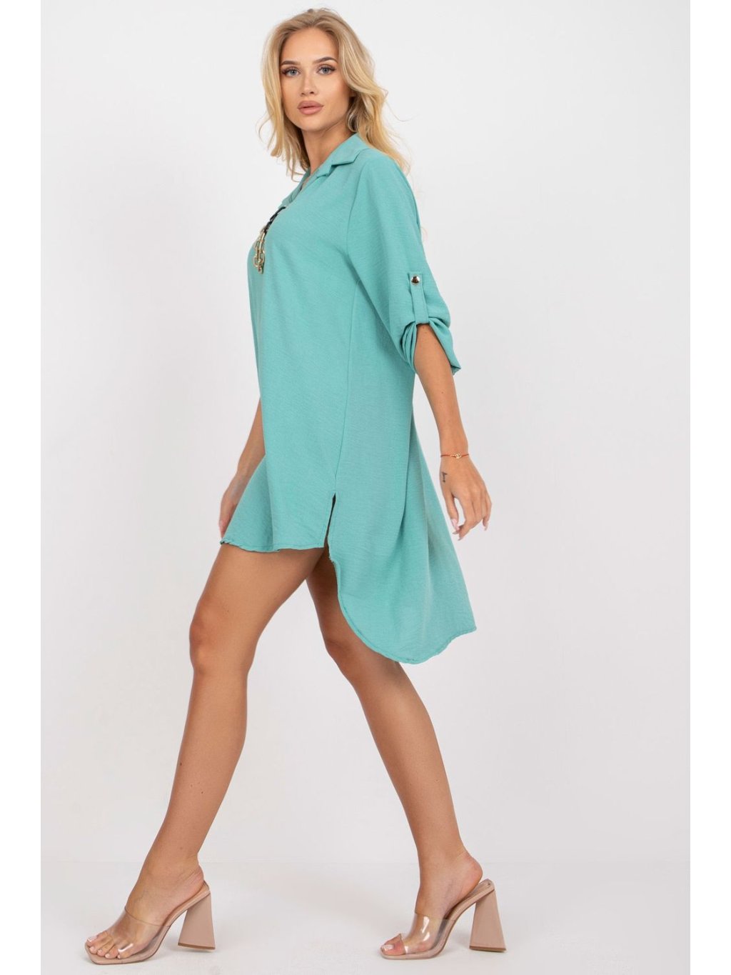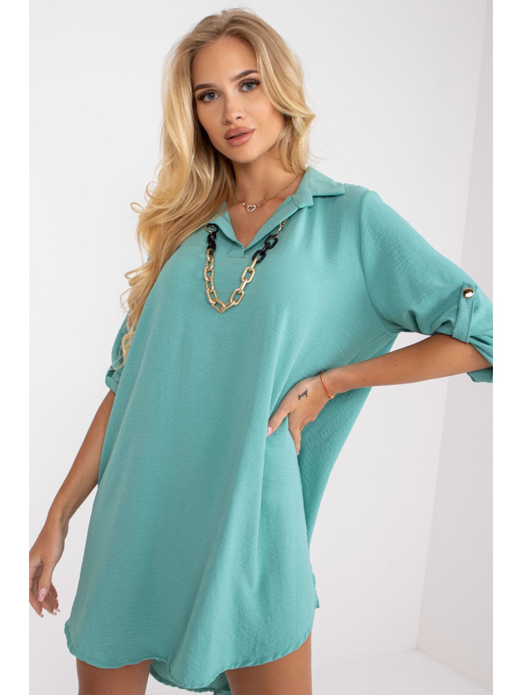 Asymetrické šaty s dlouhými rukávy a límcem. Rukávy lze složit. Řetěz pro sadu. Skvěle se hodí pro mnoho příležitostí.