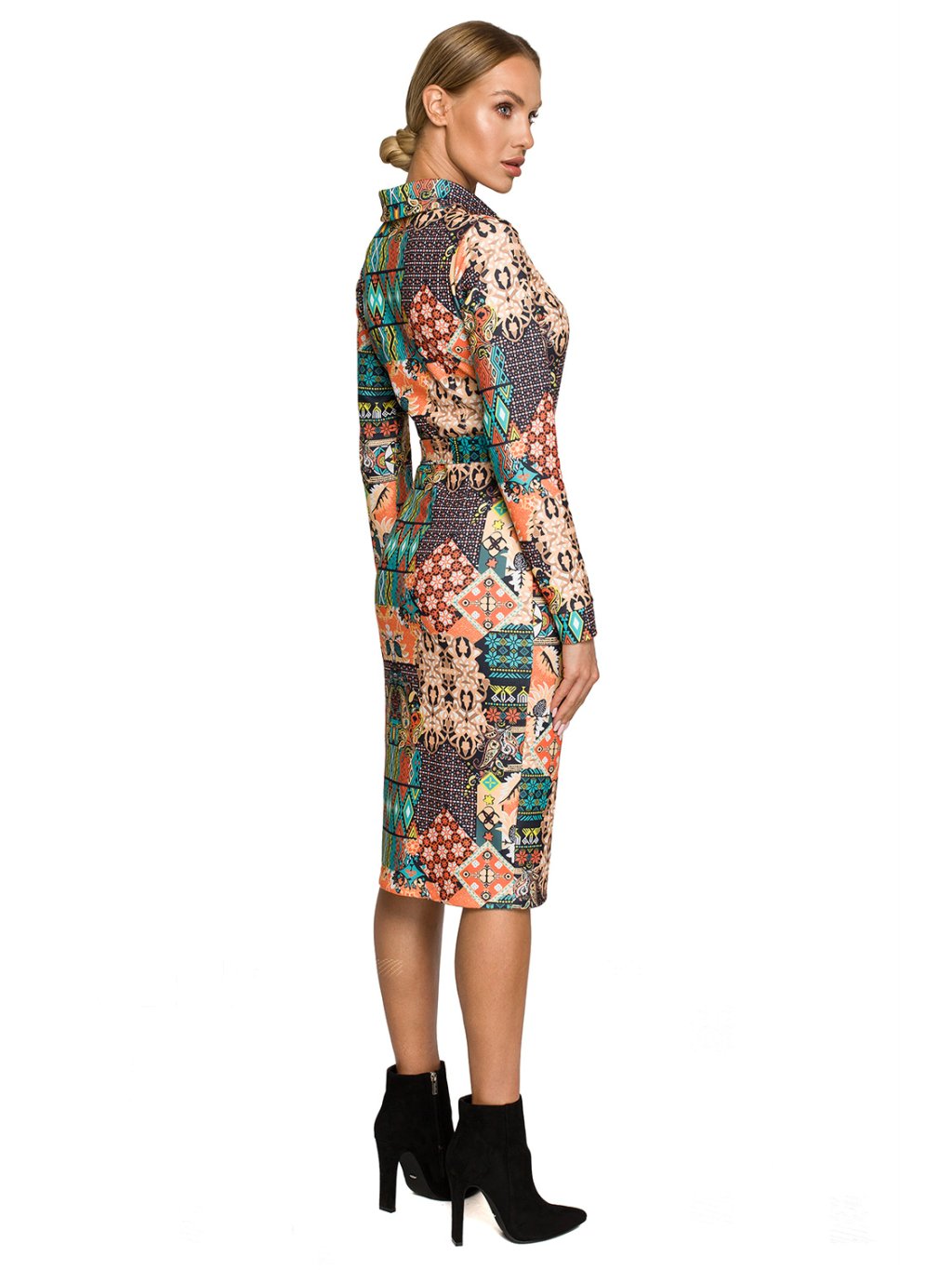 Midi šaty v tužce nemusí být nudné, pokud jsou ušity z látky se zajímavým pestrobarevným potiskem. Dbali jsme také na detaily, jako je límec, zapínání pod krkem a zavazovací pásek, který ještě více zvýrazňuje pas. Šaty se navlékají přes hlavu.