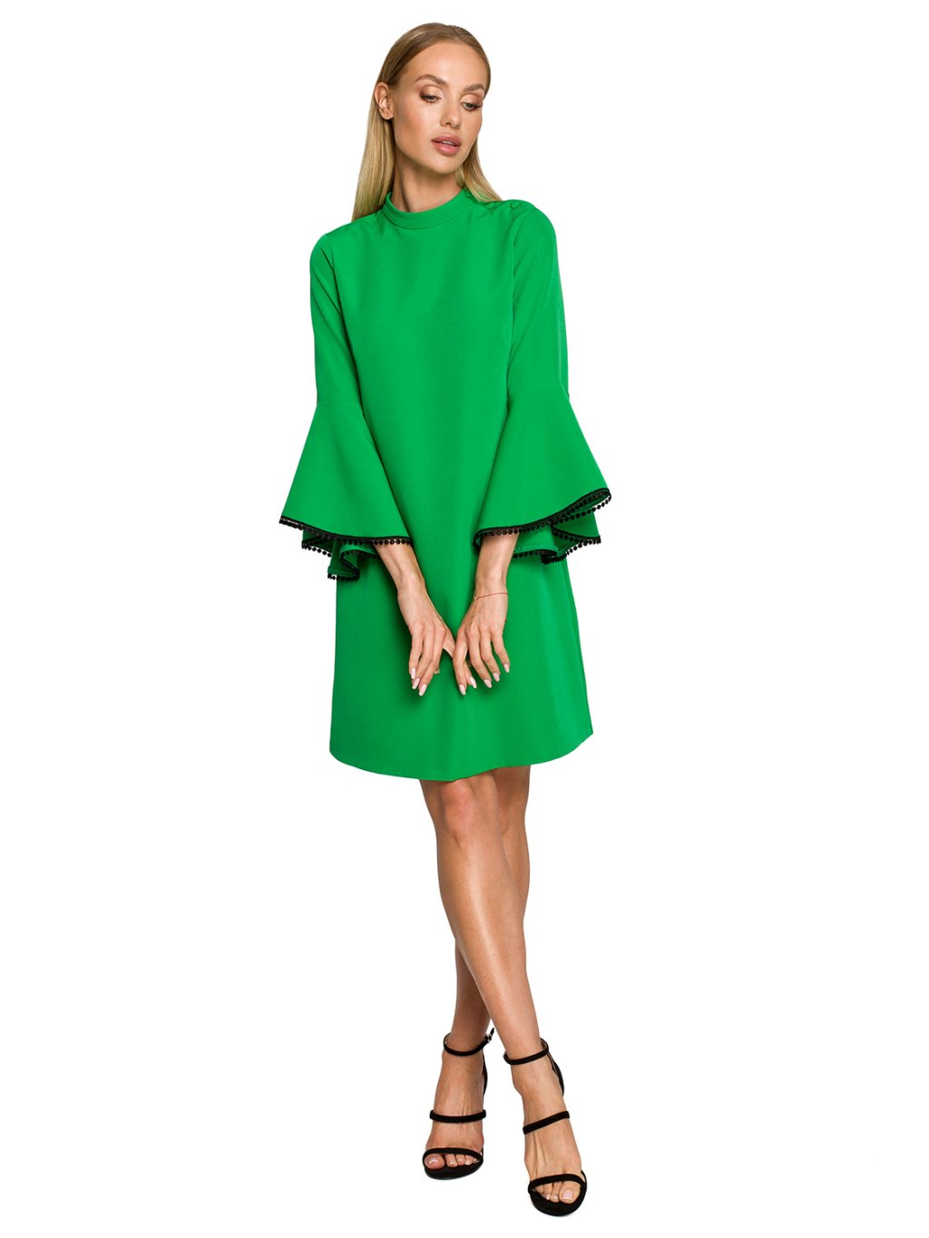 Šaty s lichoběžníkovou nebo áčkovou linií nejenže dodávají dívčí půvab, ale také pomáhají zakrýt nedostatky postavy. Dali jsme si záležet na detailech, které ho dělají výjimečným: široké, volánové rukávy jsou zdobené jemnou stuhou s kulovitým lemováním. Šaty jsou bez podšívky.