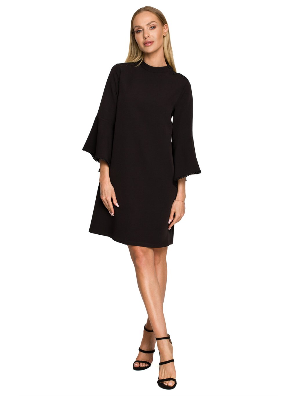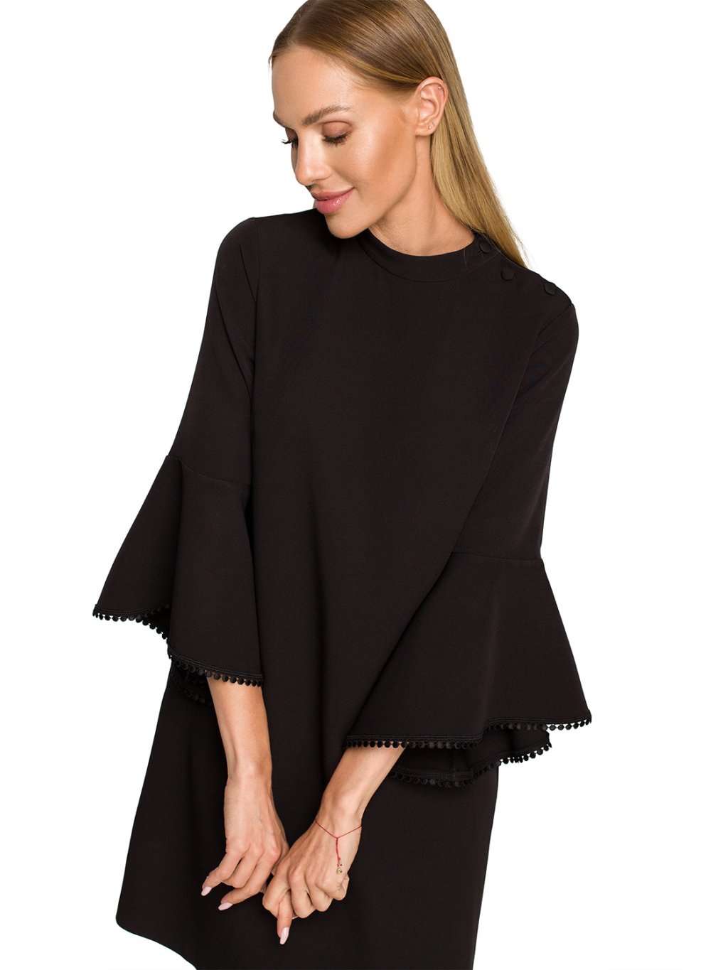 Šaty s lichoběžníkovou nebo áčkovou linií nejenže dodávají dívčí půvab, ale také pomáhají zakrýt nedostatky postavy. Dali jsme si záležet na detailech, které ho dělají výjimečným: široké, volánové rukávy jsou zdobené jemnou stuhou s kulovitým lemováním. Šaty jsou bez podšívky.