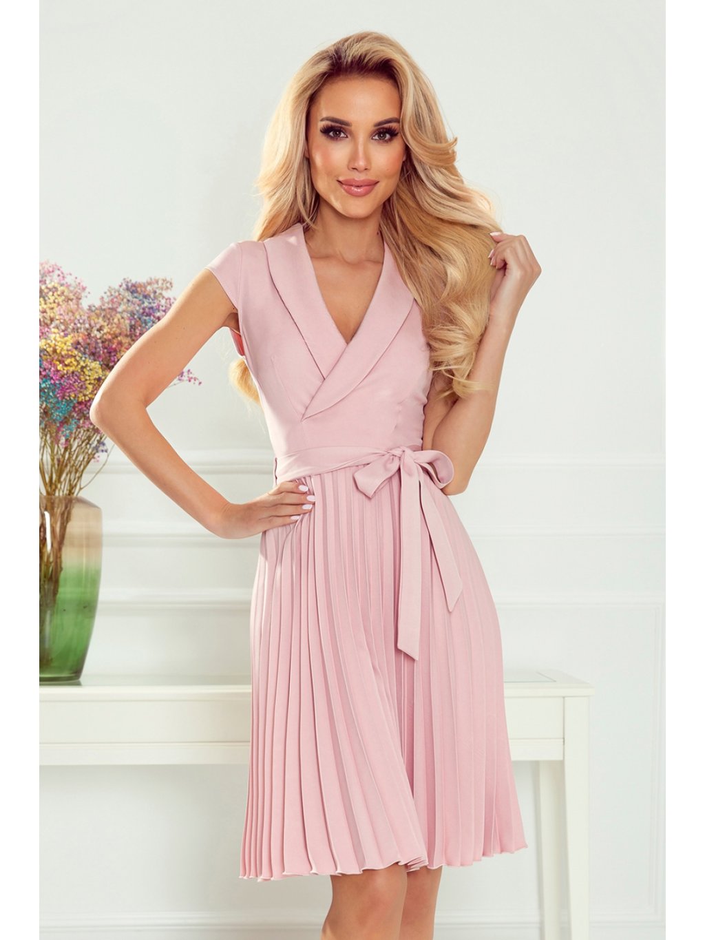 Plisované šaty s obálkovým výstřihem, krátkými rukávy a páskem. Zapínání na zádech na krytý zip. Šaty v pudrově růžové barvě. Značka numoco. Polská produkce.