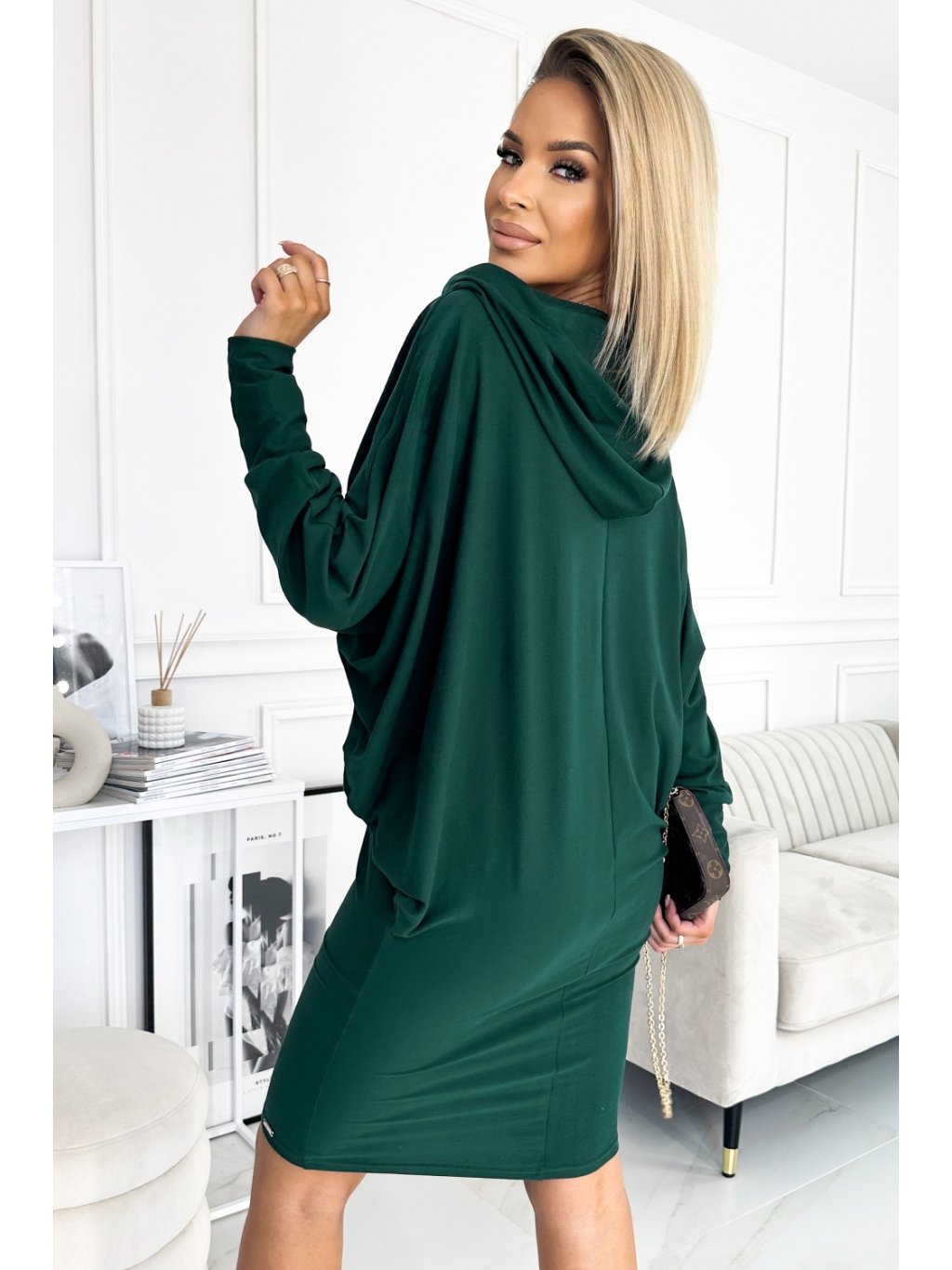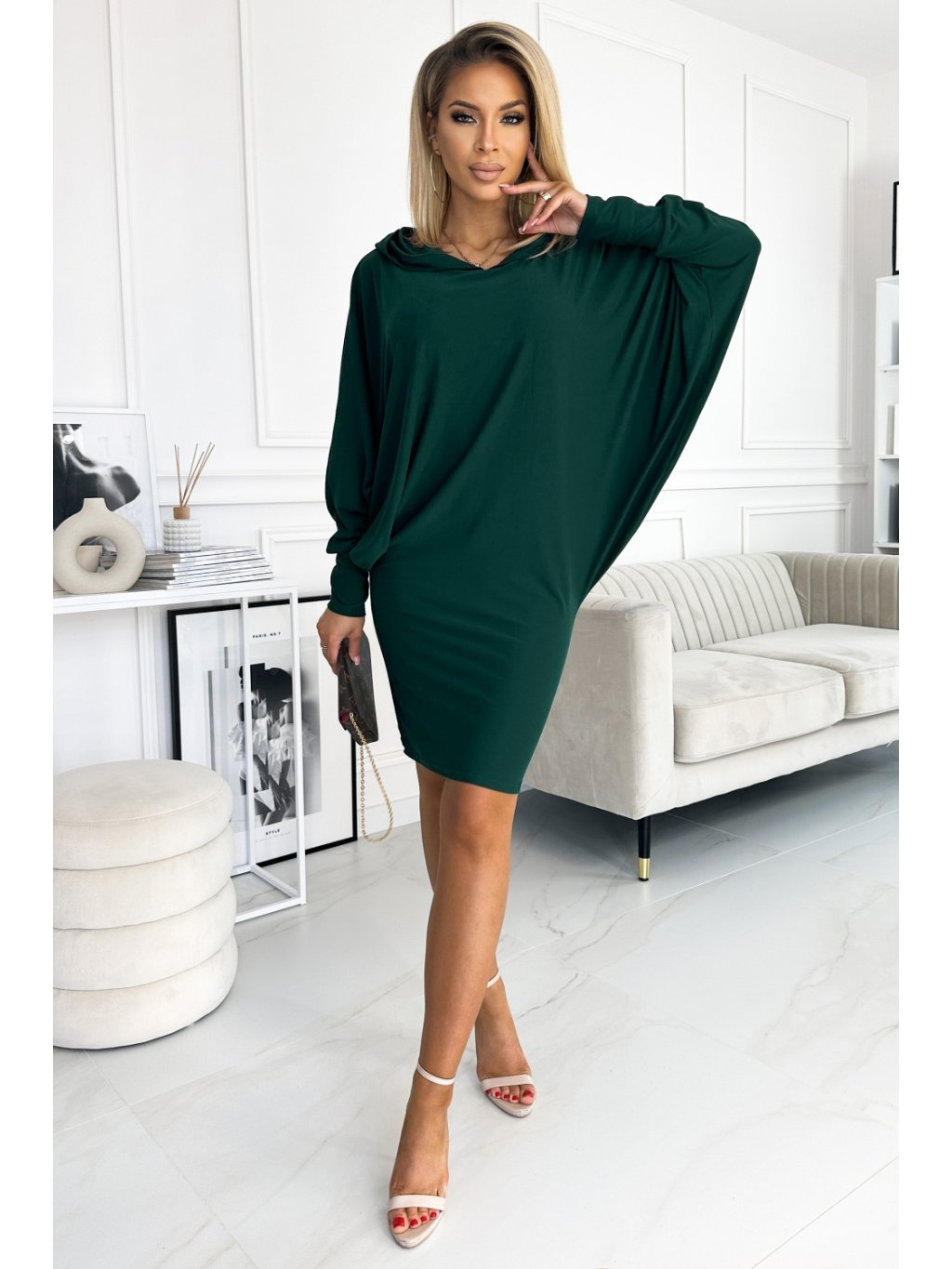 Netopýří šaty s kapucí. Je vyrobena z pružné zelené látky se semišovou strukturou. Lze je nosit různými způsoby. Značka numoco. Polská produkce.
