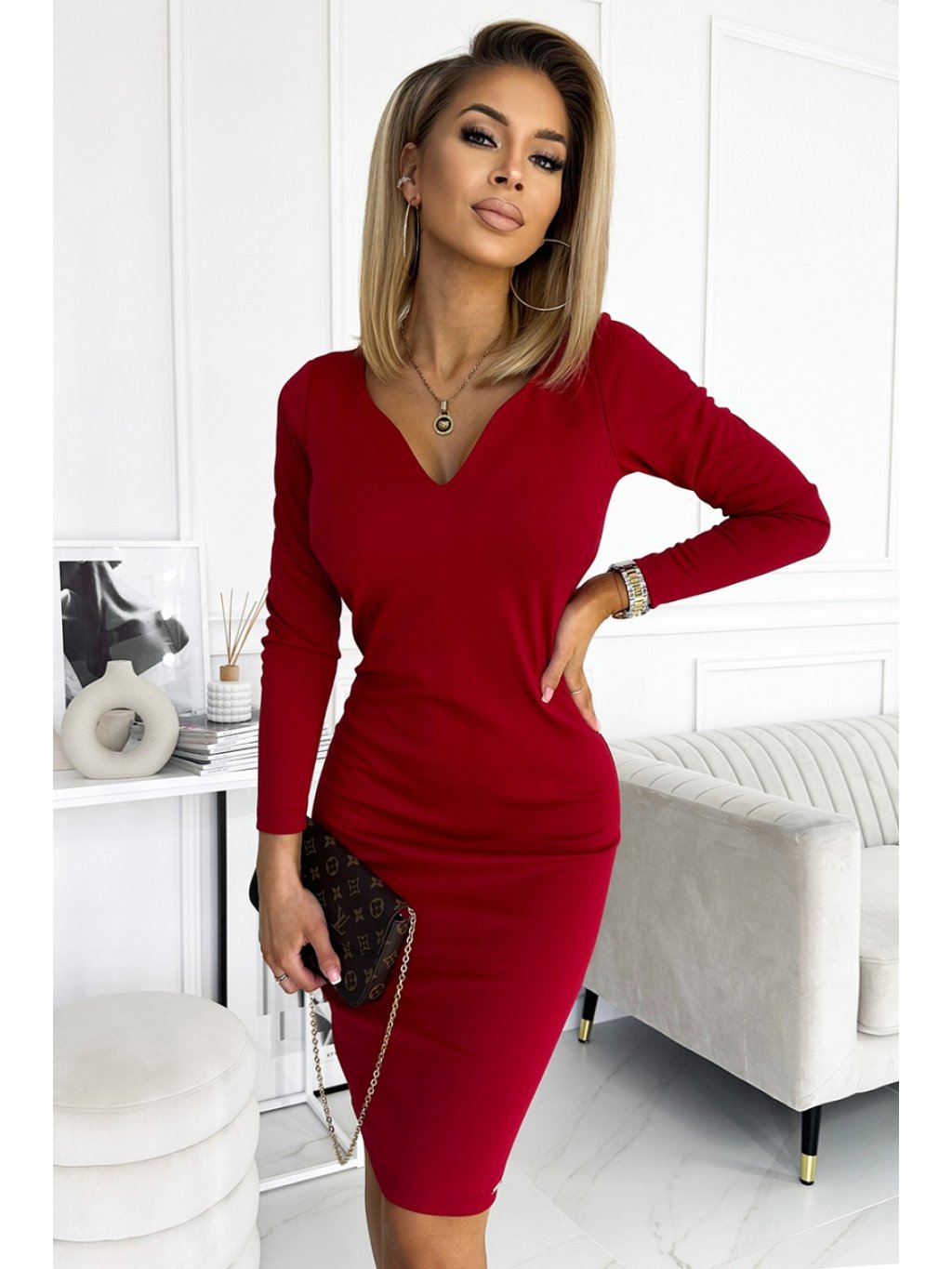 Klasické šaty s výstřihem a dlouhými rukávy. Vyrobeno z na dotek příjemného silnějšího materiálu ve vínové barvě. Zapíná se vzadu na zip. Značka numoco. Polská produkce.