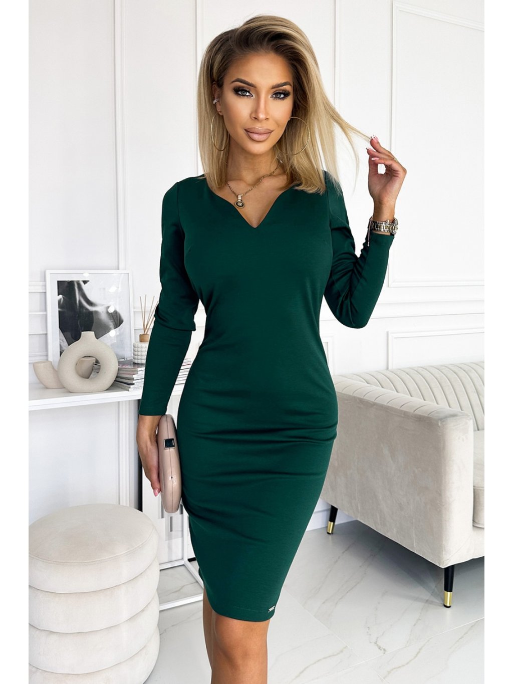Klasické šaty s výstřihem a dlouhými rukávy. Vyrobeno z na dotek příjemného silnějšího materiálu v zelené barvě. Zapíná se vzadu na zip. Značka numoco. Polská produkce.