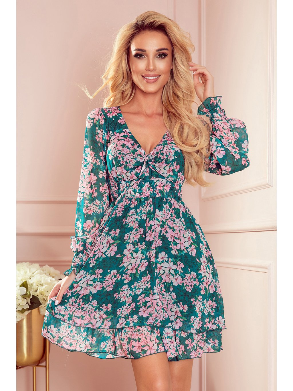 Šifonové šaty s elastickým pasem a rukávy. Půvab jim dodává výstřih, který lze libovolně zavázat. Vyrobeno z šifonu příjemného na dotek s podšívkou (95 % polyester, 5 % elastan). Značka numoco. Polská výroba.