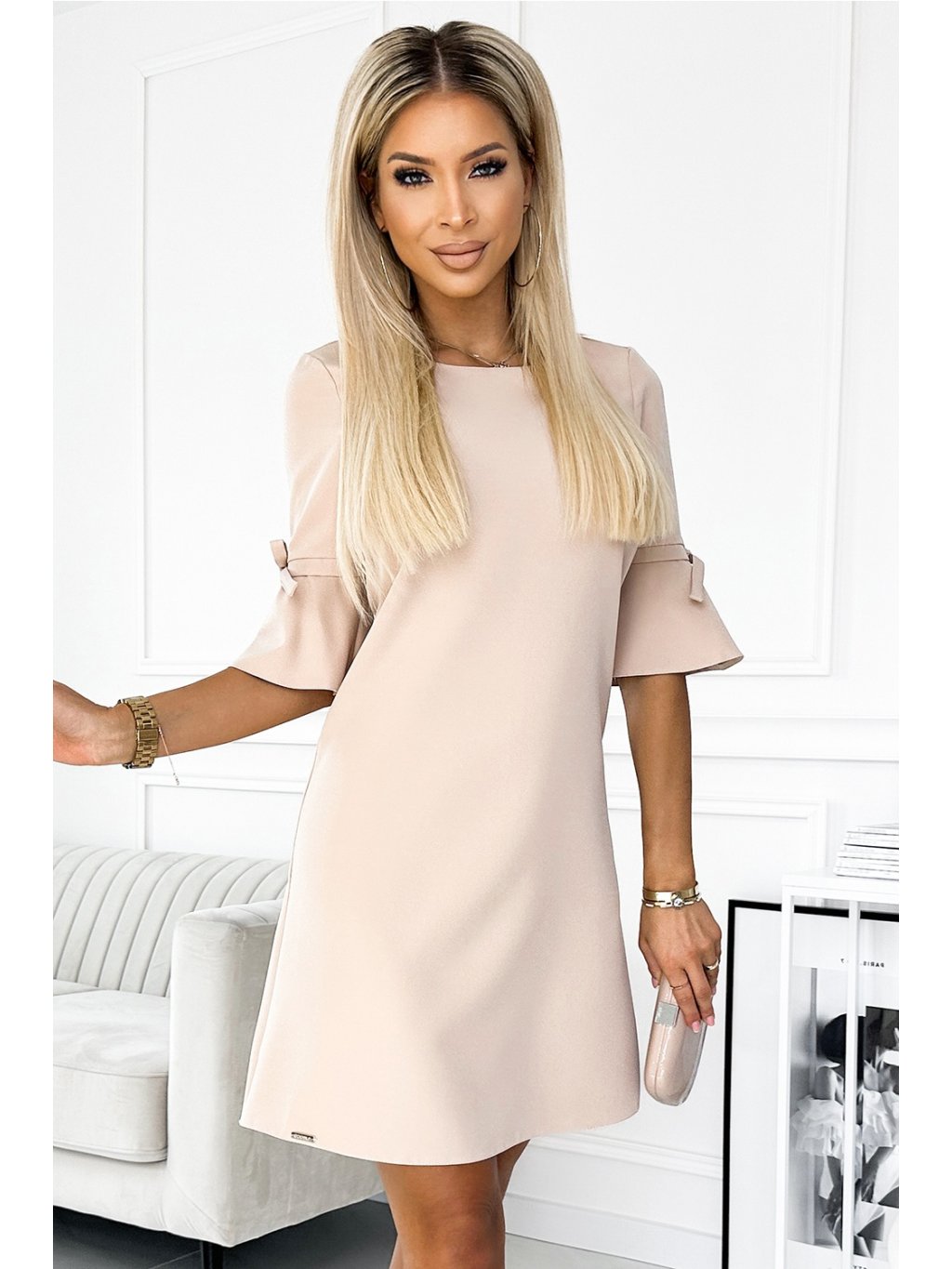 Trapézové pohodlné šaty s rozšířenými rukávy a mašlemi, velmi ženské. Šaty v béžové barvě. Polský výrobek. Značka numoco.
