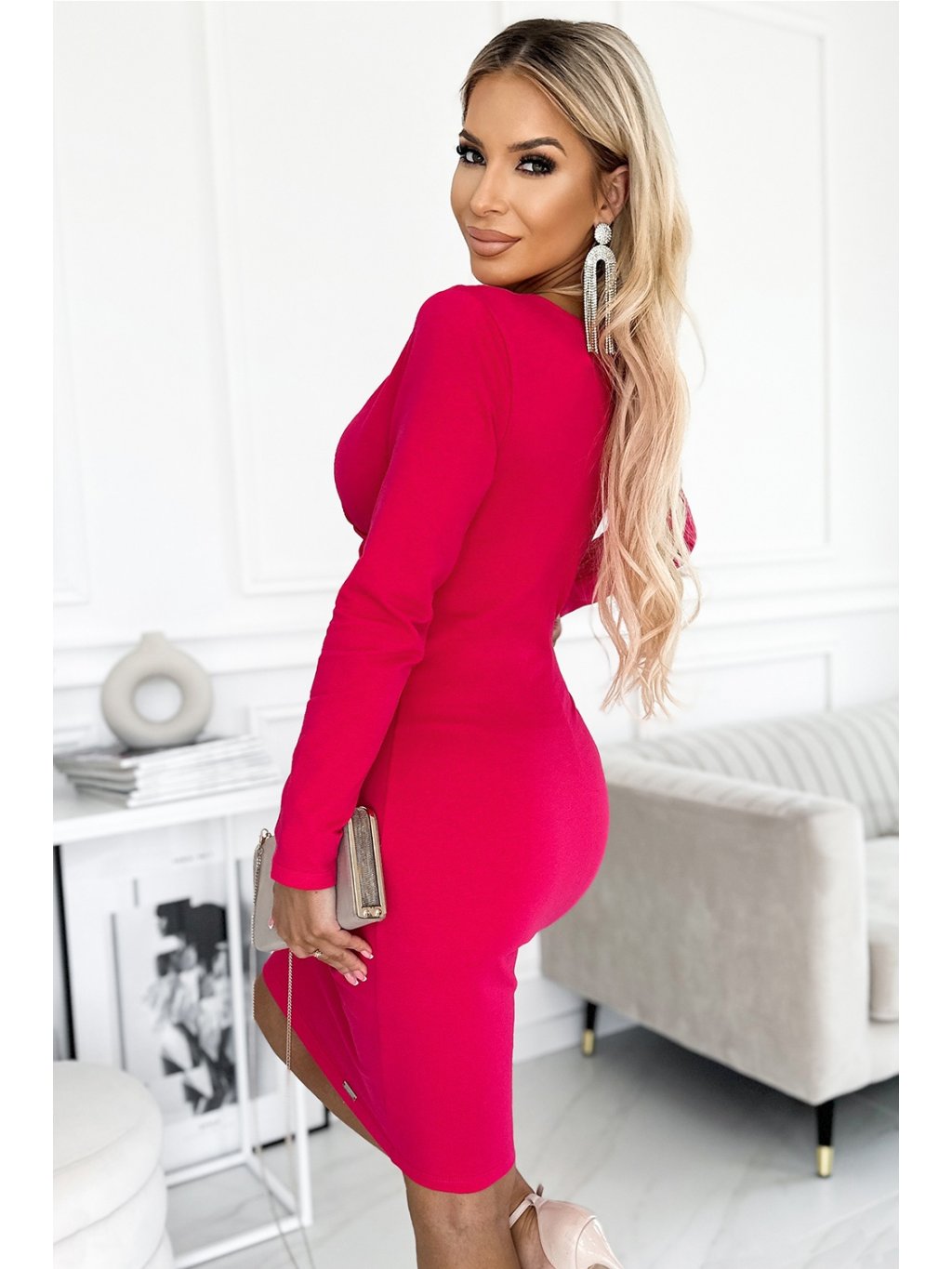 Elegantní šaty s obálkovým výstřihem a dlouhými rukávy. Jsou vyrobeny z mírně elastické bavlněné tkaniny ve fuchsiové barvě. Zapínání na zádech na krytý zip. Značka numoco. Polská výroba.