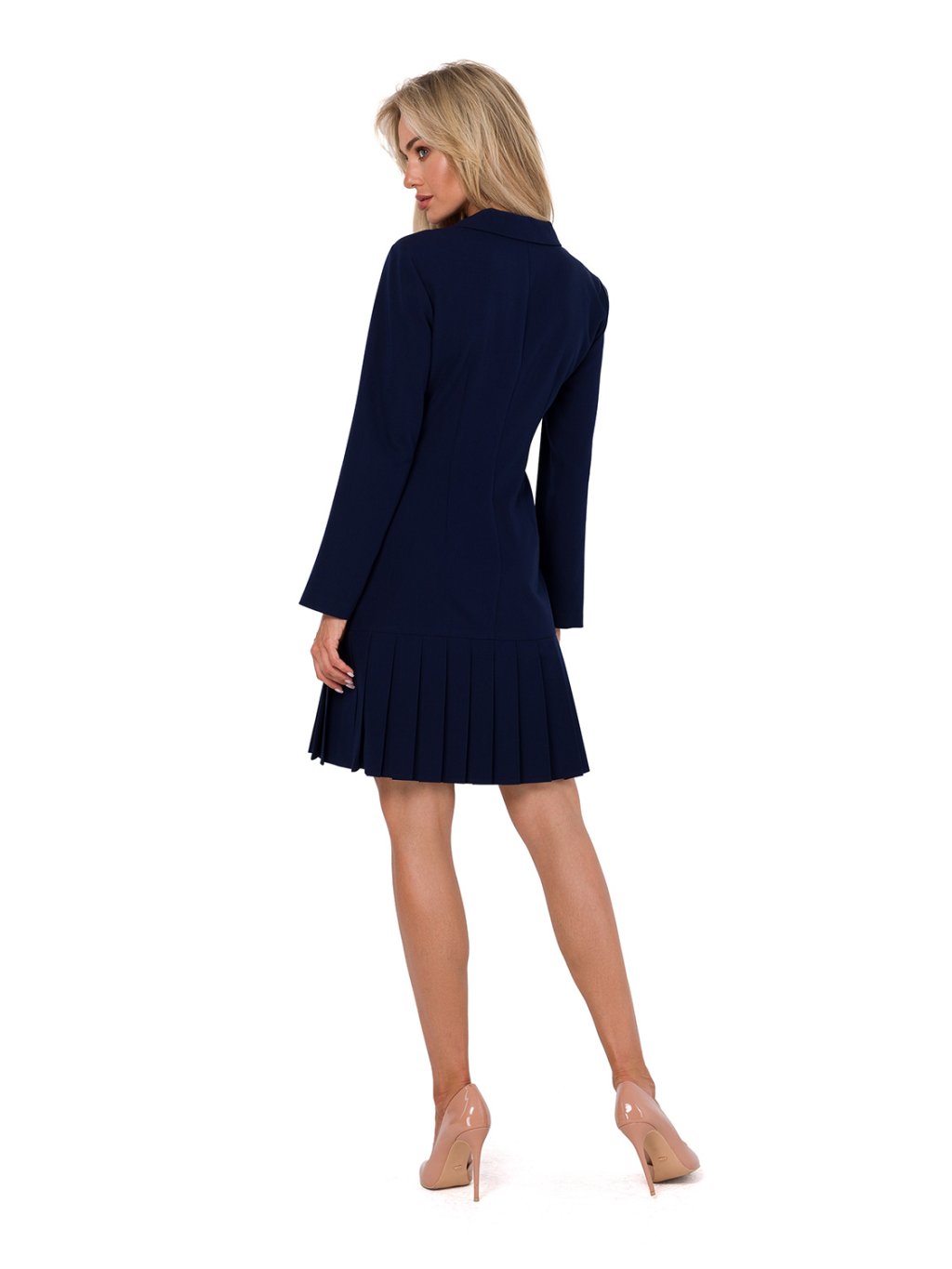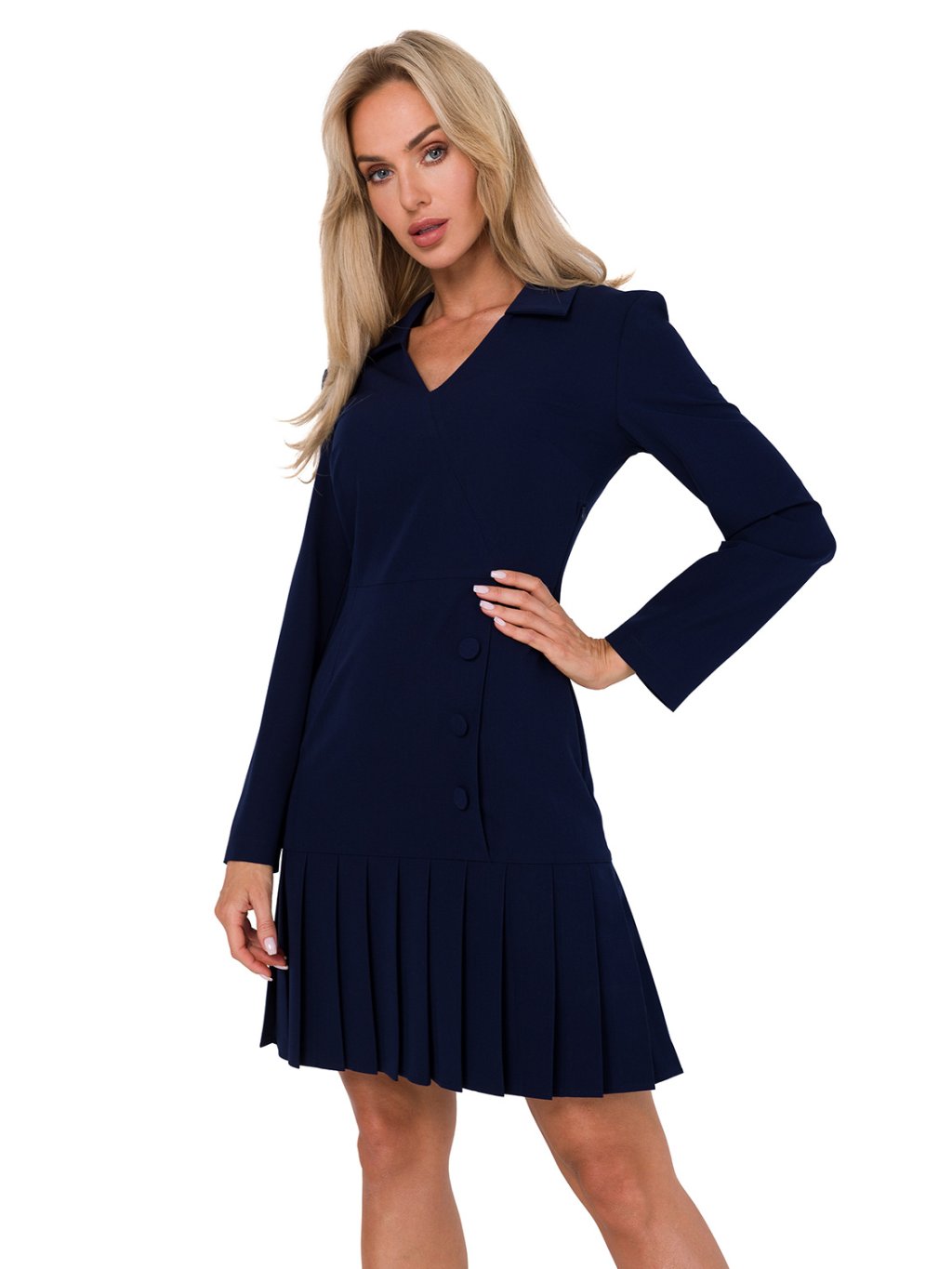 Šaty s dlouhými rukávy, límečkem a výstřihem do V. Šaty jsou v pase přestřižené a vpředu se zapínají na ozdobné knoflíky. Šaty jsou bez podšívky a zapínají se na krytý zip. Ozdobné řasení ve spodní části. Navrženo a ušito v Polsku.