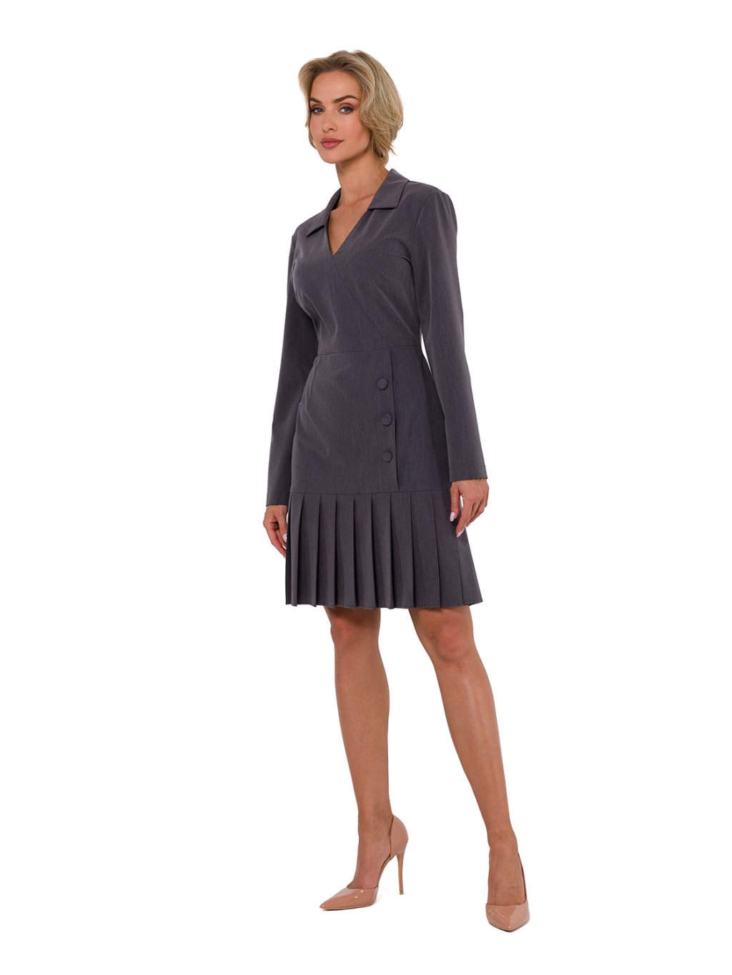 Šaty s dlouhými rukávy, límečkem a výstřihem do V. Šaty jsou v pase přestřižené a vpředu se zapínají na ozdobné knoflíky. Šaty jsou bez podšívky a zapínají se na krytý zip. Ozdobné řasení ve spodní části. Navrženo a ušito v Polsku.