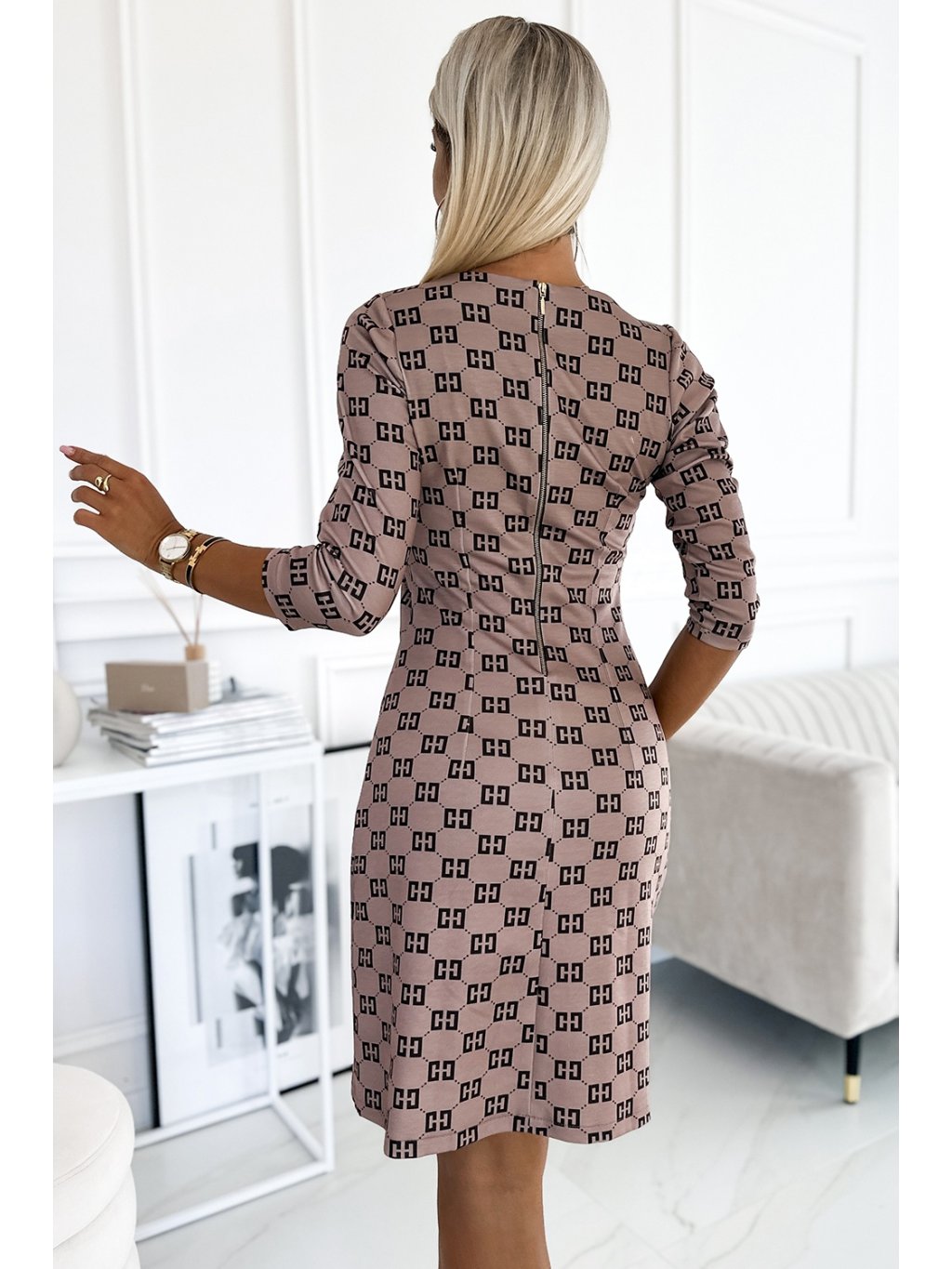 Klasické šaty Mary se zlatými zámky, 3/4 rukávy a trapézovou sukní. Jsou vyrobeny z na dotek příjemné elastické látky v béžové barvě s černým vzorem. Polský výrobek. Značka numoco.