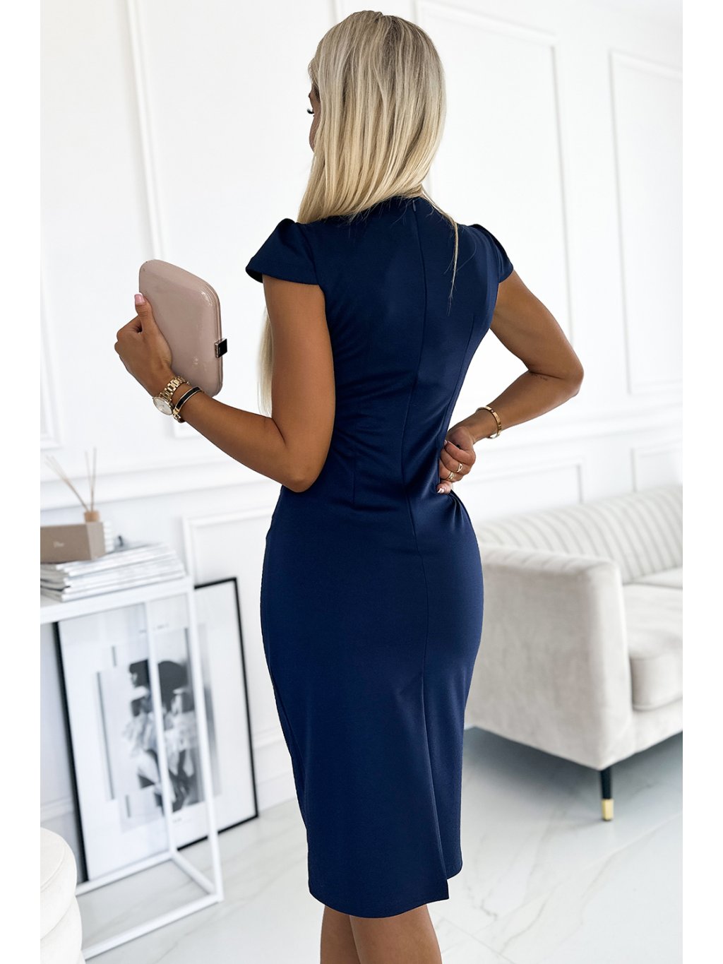 Elegantní šaty s krásným výstřihem a krátkými rukávy. Šaty v tmavě modré barvě. Klasické šaty bez zdobení ideální pro každou příležitost, od narozenin, křtin, svatby až po každodenní vycházky. Vyrobeno ze silnějšího, pružného materiálu. Polská výroba. Značka Numoco.