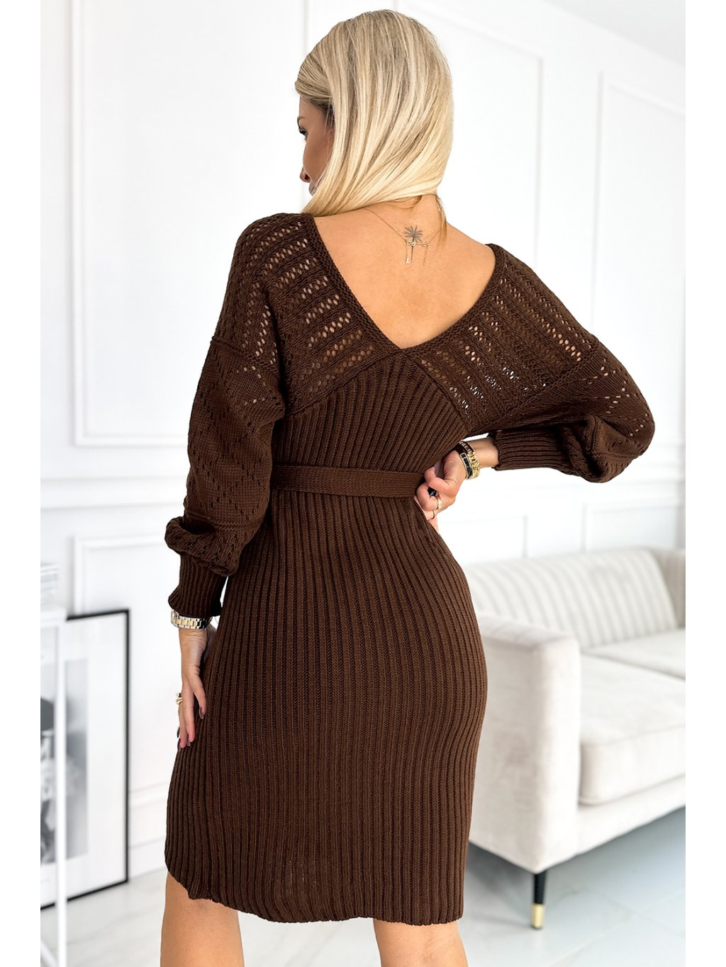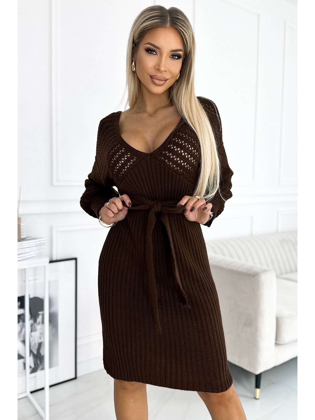 Ažurové šaty s dlouhými rukávy, výstřihem a vázáním. Jsou vyrobeny z hřejivého materiálu připomínajícího svetr v čokoládové barvě. Lze je nosit i přes jedno rameno. Evropská výroba. Značka numoco basic.