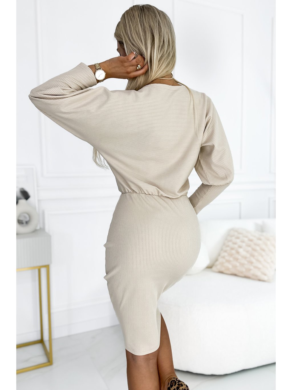 Pruhované šaty s žebrovanými manžetami. Šaty v béžové barvě. Vyrobeno z příjemného na dotek, elastického materiálu. Polská výroba. Značka numoco.