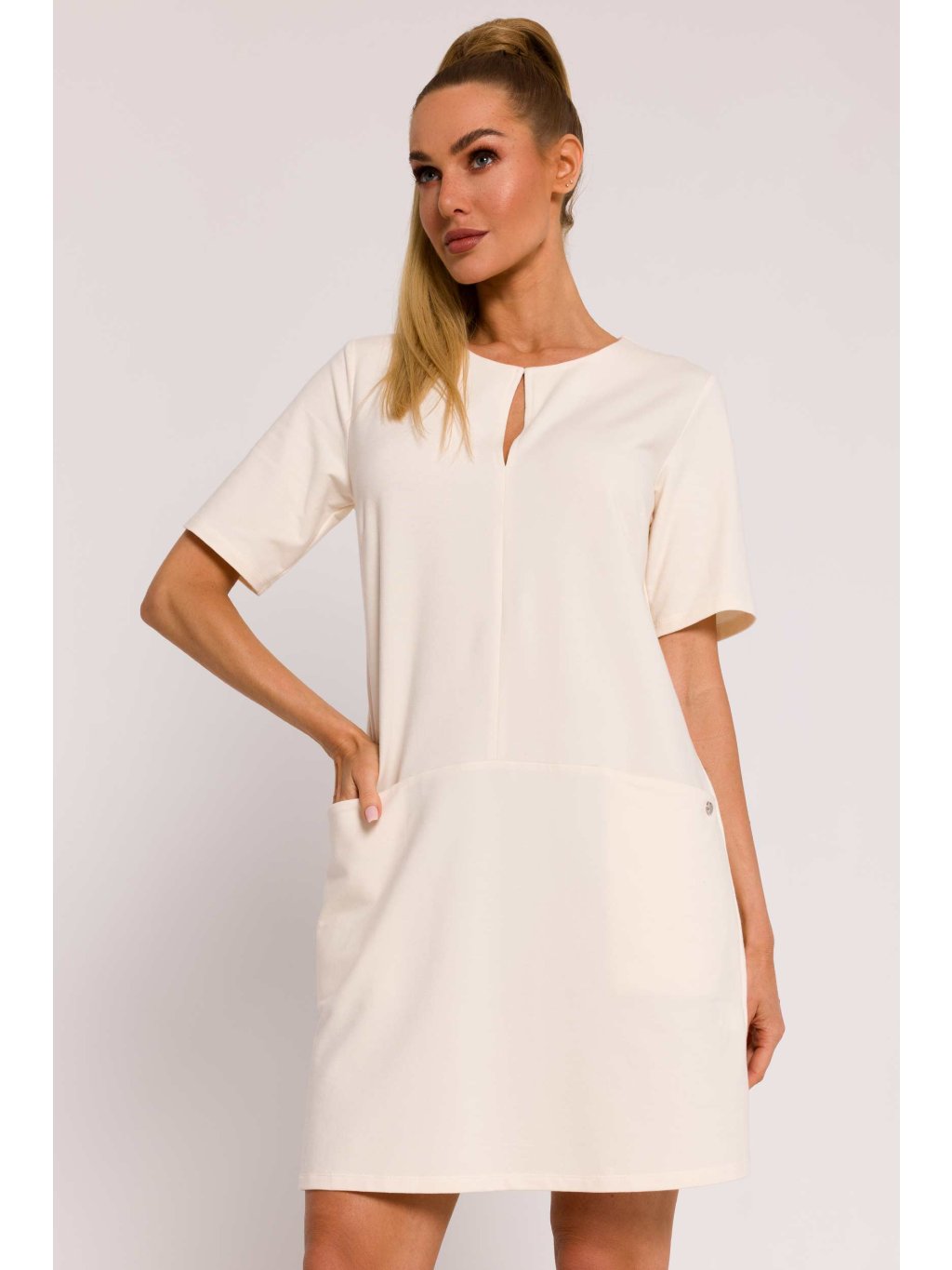 Tyto pletené šaty jsou jedinečným výrobkem, který byl navržen a vyroben s důrazem na detail v Polsku a který podtrhuje vysokou kvalitu a styl polského krejčovství. Šaty mají áčkový střih, který jim dodává lehkost a zároveň zvýrazňuje ženskou siluetu. Jemný výstřih dodává šatům jemnost a vytváří harmonickou rovnováhu mezi elegancí a každodenním pohodlím. Díky krátkým rukávům jsou šaty ideální pro teplejší dny a dodávají celkovému vzhledu lehkost. Praktické boční kapsy skryté ve švech na přední straně šatů jsou nejen funkční, ale také dodávají nonšalanci a městský nádech. Ozdobný štítek s logem umístěný na jedné z kapes je elegantním dekorativním prvkem, který podtrhuje jedinečnost šatů. Za zmínku stojí, že šaty nemají podšívku, díky čemuž jsou lehké a vzdušné, ideální pro letní dny. Tento oděv nejen podtrhuje polský design a krejčovskou tradici, ale také spojuje funkčnost, pohodlí a módní styl. Tyto šaty jsou vynikající volbou pro ženy, které hledají jedinečný kousek oblečení, ideální jak pro každodenní nošení, tak pro zvláštní příležitosti.