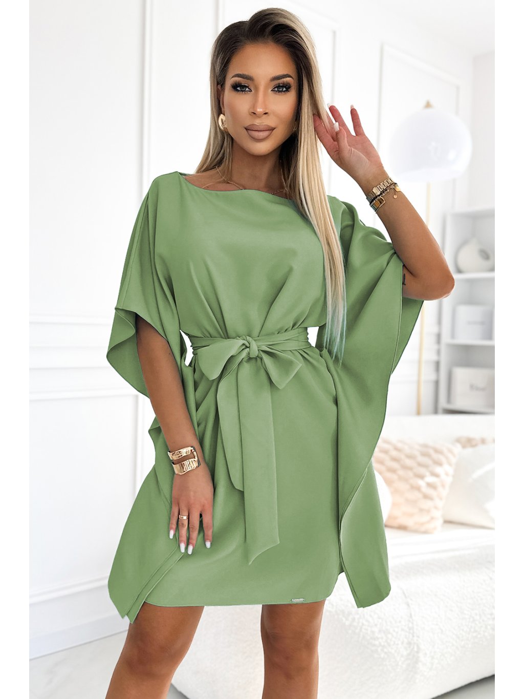 Motýlkové šaty se šálkem v olivové barvě. Vyrobena z příjemného na dotek materiálu. Značka numoco. Výroba v Polsku.