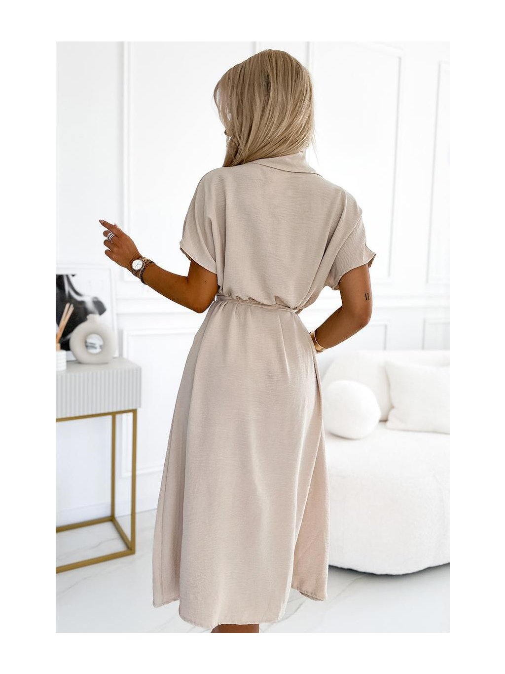 Béžové smirkové šaty se zlatými knoflíky, zavazováním v pase a krátkými rukávy. Značka numoco basic. Evropská výroba.