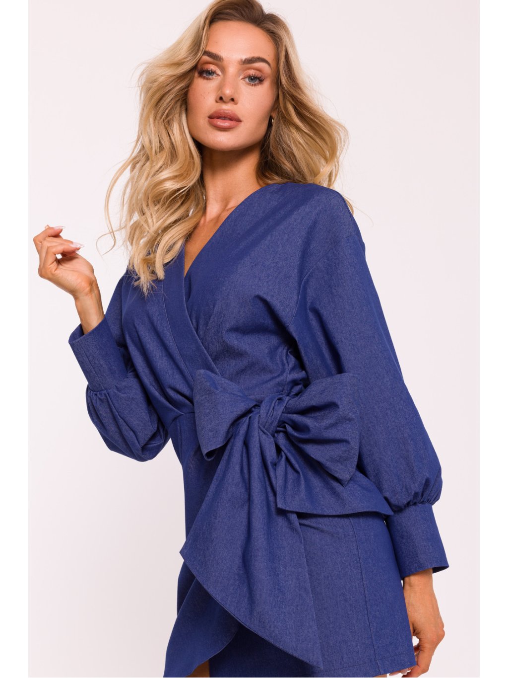 Stylové mini šaty s překlápěcím střihem, šité z vysokokvalitní bavlněné látky. Šaty jsou zapínány po straně, což umožňuje ideální přizpůsobení postavy, a asymetrický přední díl dodává moderní charakter. Dlouhé rukávy zajišťují elegantní vzhled a absence podšívky zaručuje, že jsou lehké a pohodlné na nošení. Tyto šaty jsou navrženy a vyrobeny v Polsku a spojují v sobě pohodlí a výjimečný styl, ideální na různé příležitosti.