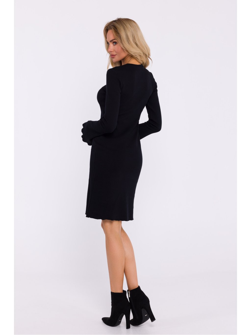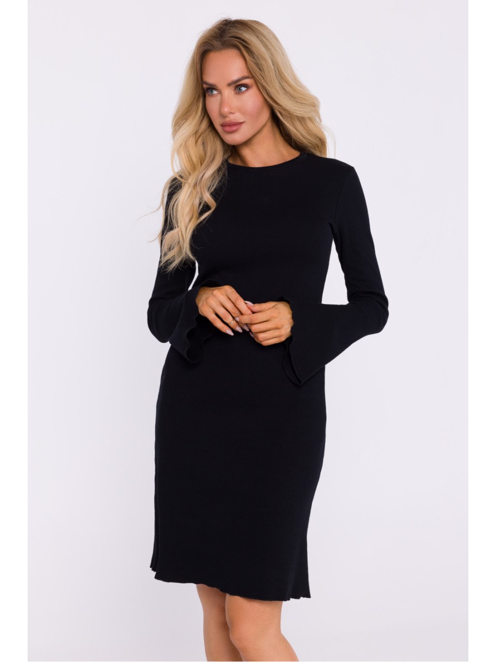 Tyto šaty s dlouhými rukávy, vyrobené z žebrovaného bavlněného úpletu, dokonale padnou postavě a zdůrazní tvar přesýpacích hodin. Klasický střih zajišťuje pohodlné nošení, zatímco ozdobný lem na spodní části dodává šatům jemnou eleganci. Šaty se nosí přes hlavu, jsou praktické a pohodlné a díky délce ke kolenům se hodí jak pro každodenní, tak pro slavnostnější příležitosti. Šaty byly navrženy a ušity v Polsku, což zaručuje vysokou kvalitu a pečlivé zpracování.