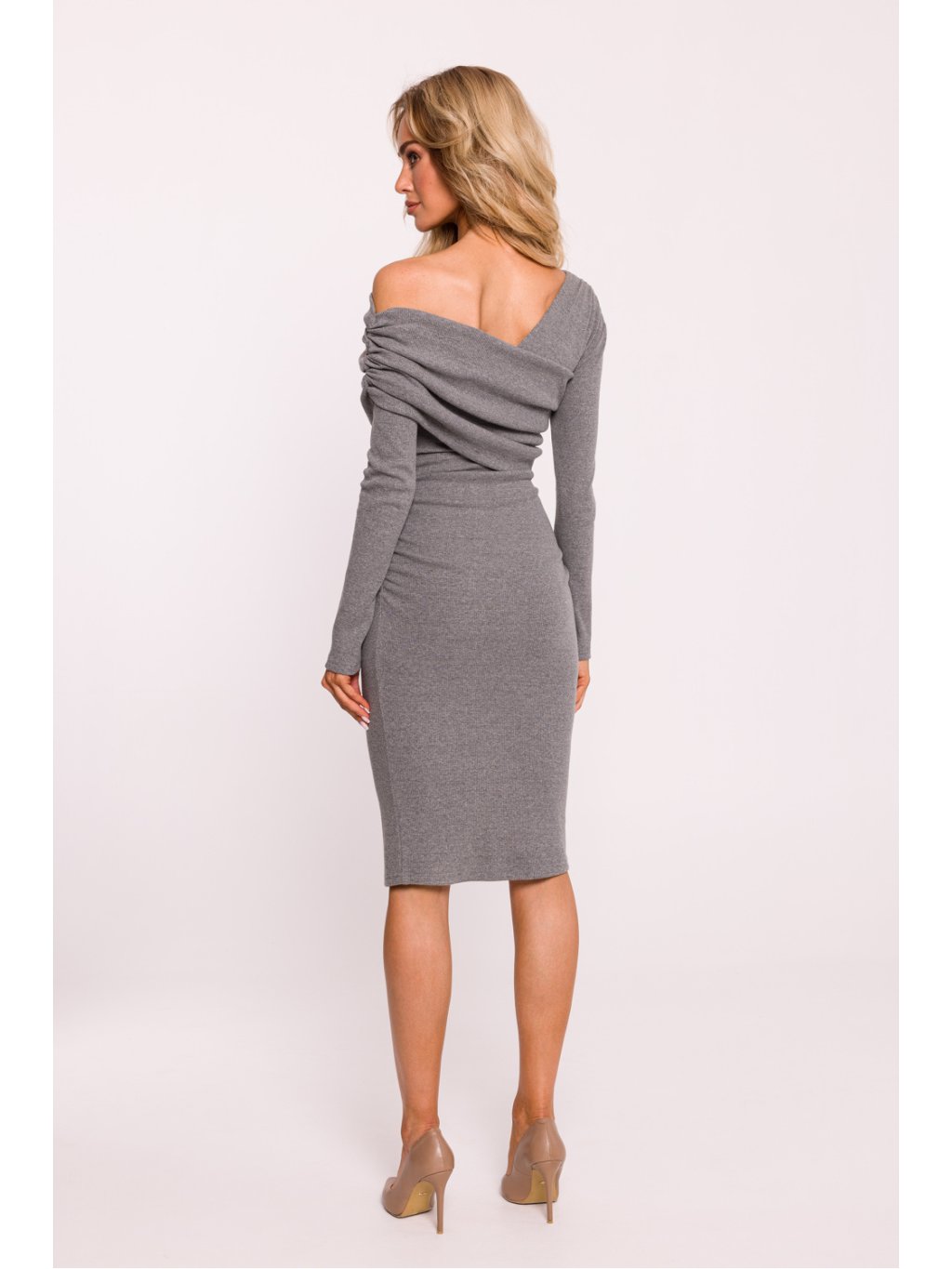 Tyto šaty s dlouhými rukávy jsou vyrobeny z žebrovaného bavlněného úpletu a mají vypasovaný střih, který jemně zvýrazňuje siluetu. Nosí se přes hlavu, jsou pohodlné a asymetrický výstřih jim dodává moderní, zajímavý charakter. Dodatečné řasení na boku dodává střihu dynamiku a eleganci a zároveň zeštíhluje siluetu. Šaty byly navrženy a ušity v Polsku, což svědčí o preciznosti výroby a nejvyšší kvalitě materiálů. Ideální pro zvláštní příležitosti i každodenní nošení.