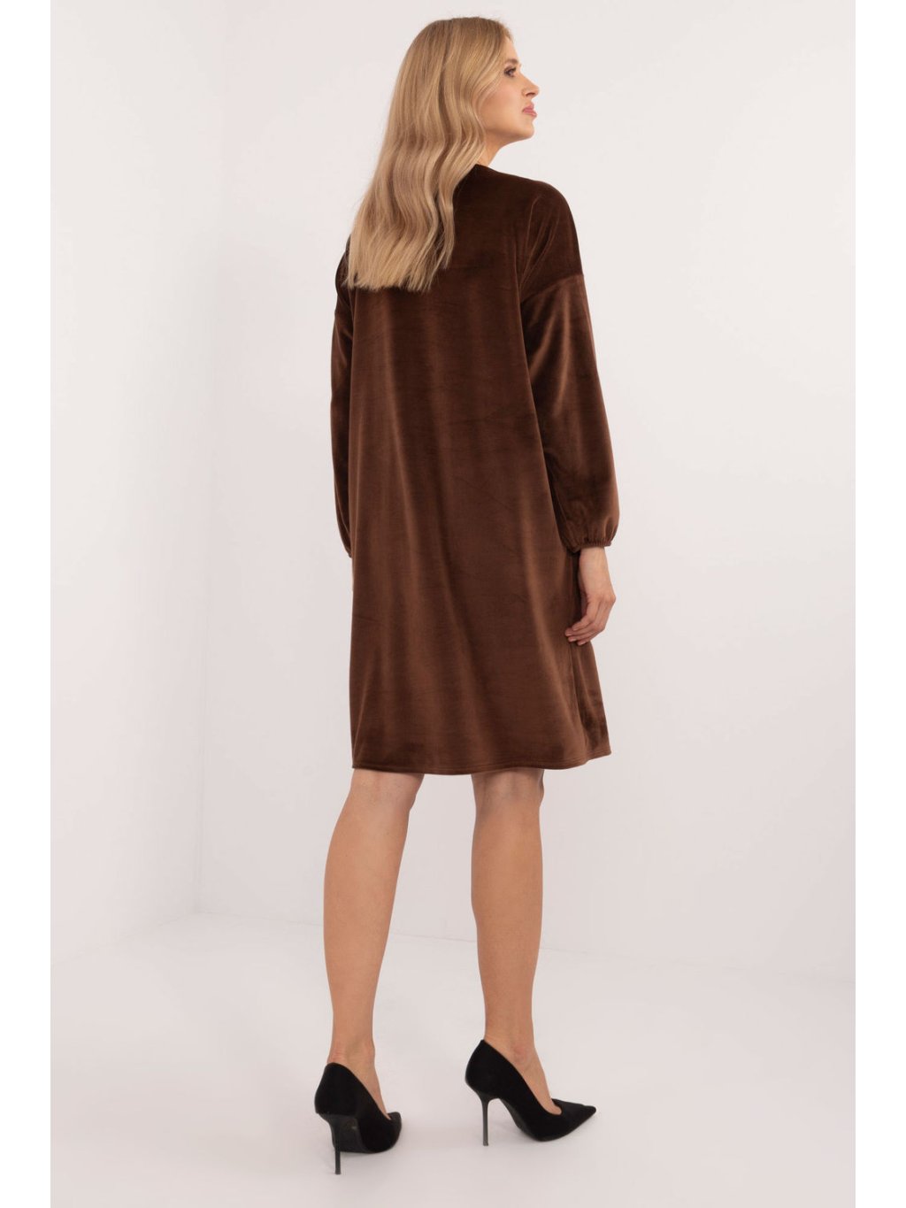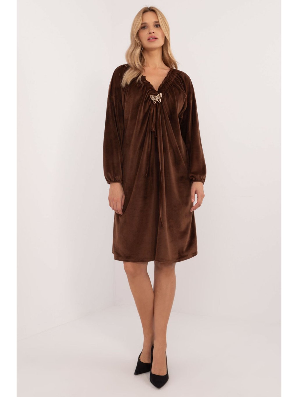 Velurové šaty pro každodenní nošení jednoduchého střihu, které kombinují pohodlí a styl a jsou ideální pro všechny každodenní příležitosti. Šaty jsou vyrobeny z vysoce kvalitních materiálů kombinujících polyester a elastan a nabízejí příjemný střih a volnost pohybu. Mají hladký design a elegantní srdíčkový výstřih, který opticky prodlužuje krk. Dlouhé rukávy dodávají šatům noblesu, zatímco ozdobné řasení ve výstřihu působí decentně a jedinečně. Další zajímavostí je odnímatelná visačka s motýlkem, která celému vzhledu dodává punc originality. Díky délce pod kolena jsou šaty ideální pro každodenní nošení a absence zapínání usnadňuje jejich oblékání. Jsou ideální volbou pro ženy, které ocení pohodlí a zároveň chtějí vypadat elegantně a módně.