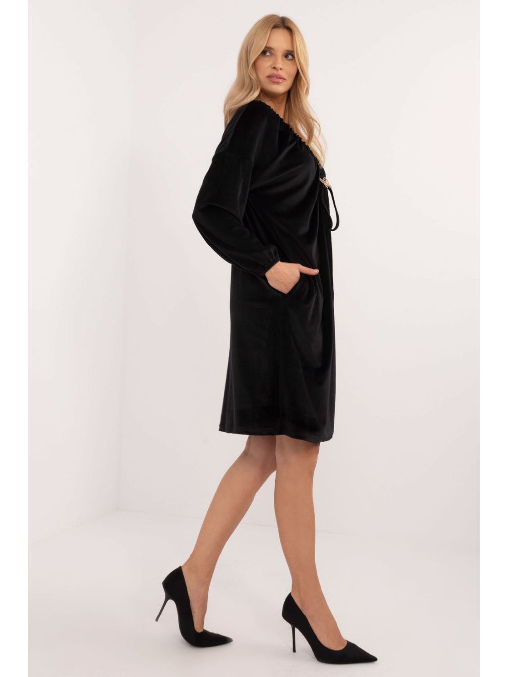 Velurové šaty pro každodenní nošení jednoduchého střihu, které kombinují pohodlí a styl a jsou ideální pro všechny každodenní příležitosti. Šaty jsou vyrobeny z vysoce kvalitních materiálů kombinujících polyester a elastan a nabízejí příjemný střih a volnost pohybu. Mají hladký design a elegantní srdíčkový výstřih, který opticky prodlužuje krk. Dlouhé rukávy dodávají šatům noblesu, zatímco ozdobné řasení ve výstřihu působí decentně a jedinečně. Další zajímavostí je odnímatelná visačka s motýlkem, která celému vzhledu dodává punc originality. Díky délce pod kolena jsou šaty ideální pro každodenní nošení a absence zapínání usnadňuje jejich oblékání. Jsou ideální volbou pro ženy, které ocení pohodlí a zároveň chtějí vypadat elegantně a módně.