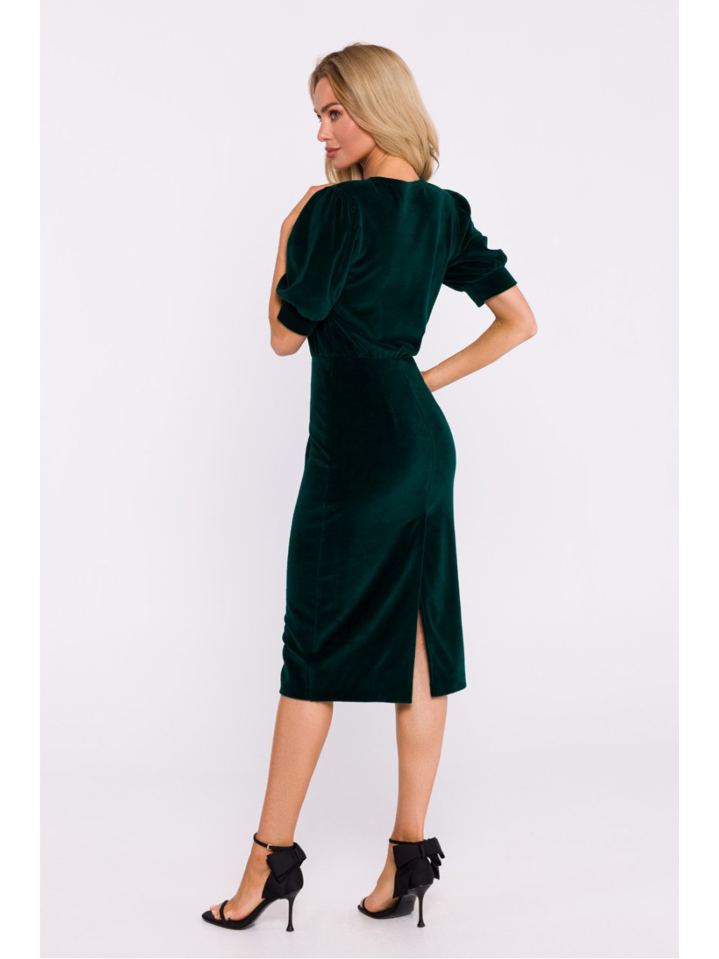 Elegantní šaty z měkkého velurového úpletu kombinují pohodlí s vytříbeným stylem. Střih v pase dokonale zvýrazňuje pas a tužková spodní část šatů sahající za kolena dodává celým šatům klasický charakter. Krátké manžetové rukávy dodávají šatům jemnou eleganci a na zádech je rozparek, který umožňuje volnost pohybu a vnáší do stylizace lehkost. Model nemá podšívku, takže je lehký a pohodlný na nošení. Šaty se zapínají na krytý zip na boku, který zajišťuje diskrétní zapínání. Šaty byly navrženy a ušity v Polsku a jsou ideální volbou pro výjimečné příležitosti, při nichž je elegance a styl na prvním místě.
