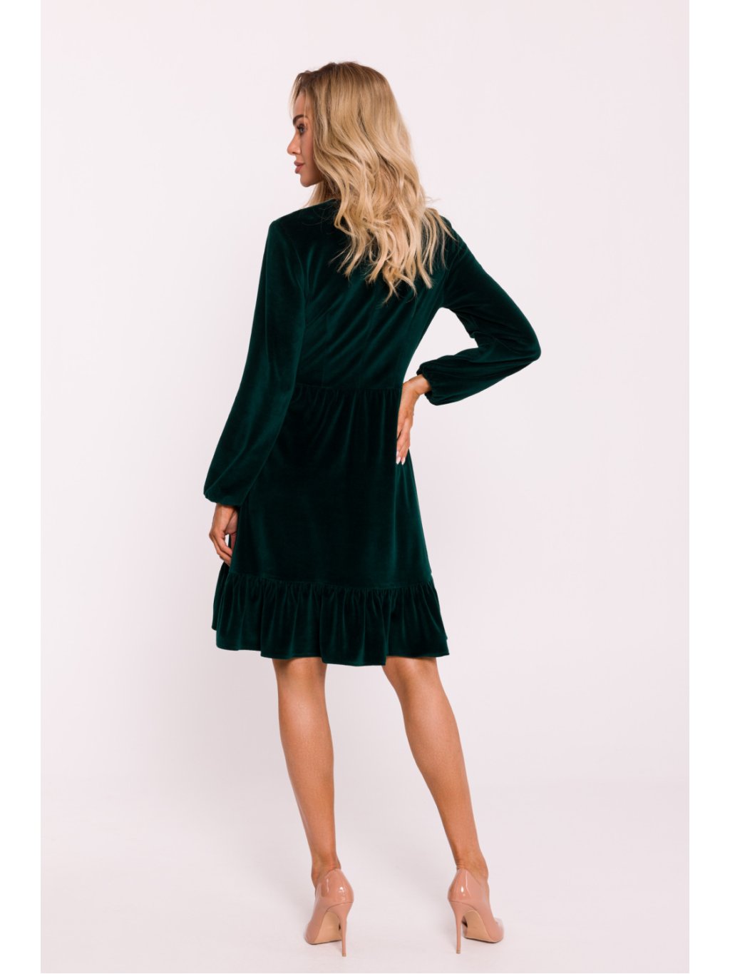 Stylové šaty z měkkého velurového úpletu, které kombinují eleganci s pohodlím. Model se zvýrazněným pasem, který krásně odhaluje ženskou siluetu, a hlubokým výstřihem ve tvaru V, který celku dodává smyslnost. Dlouhé bufetové rukávy zakončené gumou dodávají šatům romantický a lehký charakter. Spodní část šatů je mírně rozšířená a zakončená volánkem, který vnáší do šatů jemný pohyb a eleganci, a délka pod kolena je předurčuje k mnoha příležitostem. Skrytý zip na boku zajišťuje pohodlné zapínání a díky absenci podšívky jsou šaty lehké a pohodlné na nošení. Tyto šaty, navržené a ušité v Polsku, jsou ideální volbou pro ženy, které chtějí spojit módní vzhled s pohodlím pro každodenní nošení i výjimečné události.