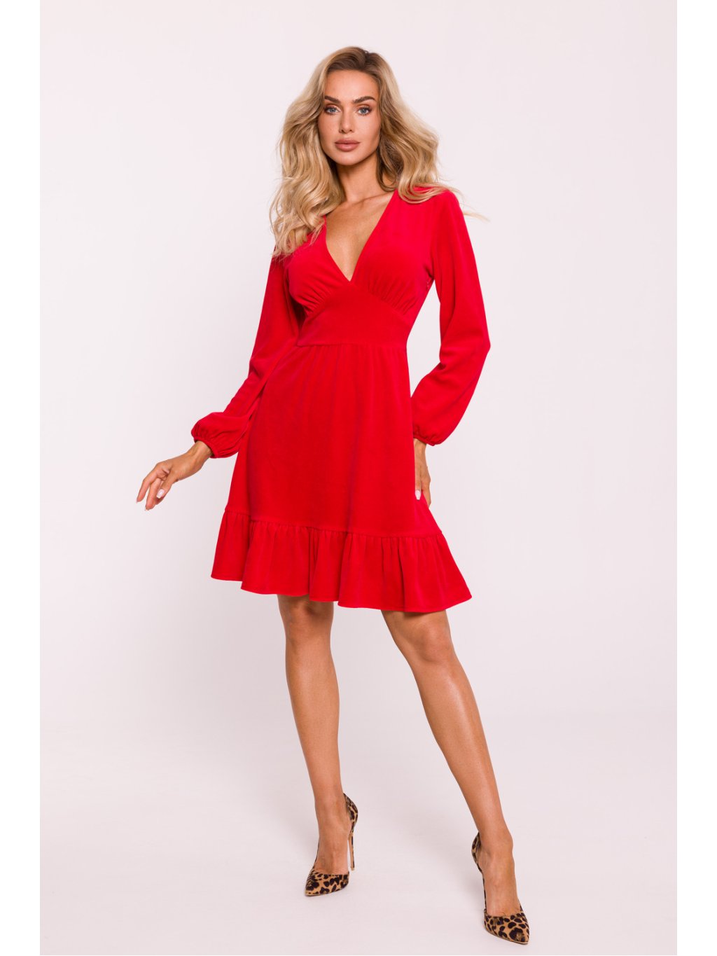 Stylové šaty z měkkého velurového úpletu, které kombinují eleganci s pohodlím. Model se zvýrazněným pasem, který krásně odhaluje ženskou siluetu, a hlubokým výstřihem ve tvaru V, který celku dodává smyslnost. Dlouhé bufetové rukávy zakončené gumou dodávají šatům romantický a lehký charakter. Spodní část šatů je mírně rozšířená a zakončená volánkem, který vnáší do šatů jemný pohyb a eleganci, a délka pod kolena je předurčuje k mnoha příležitostem. Skrytý zip na boku zajišťuje pohodlné zapínání a díky absenci podšívky jsou šaty lehké a pohodlné na nošení. Tyto šaty, navržené a ušité v Polsku, jsou ideální volbou pro ženy, které chtějí spojit módní vzhled s pohodlím pro každodenní nošení i výjimečné události.
