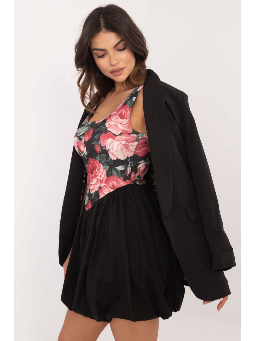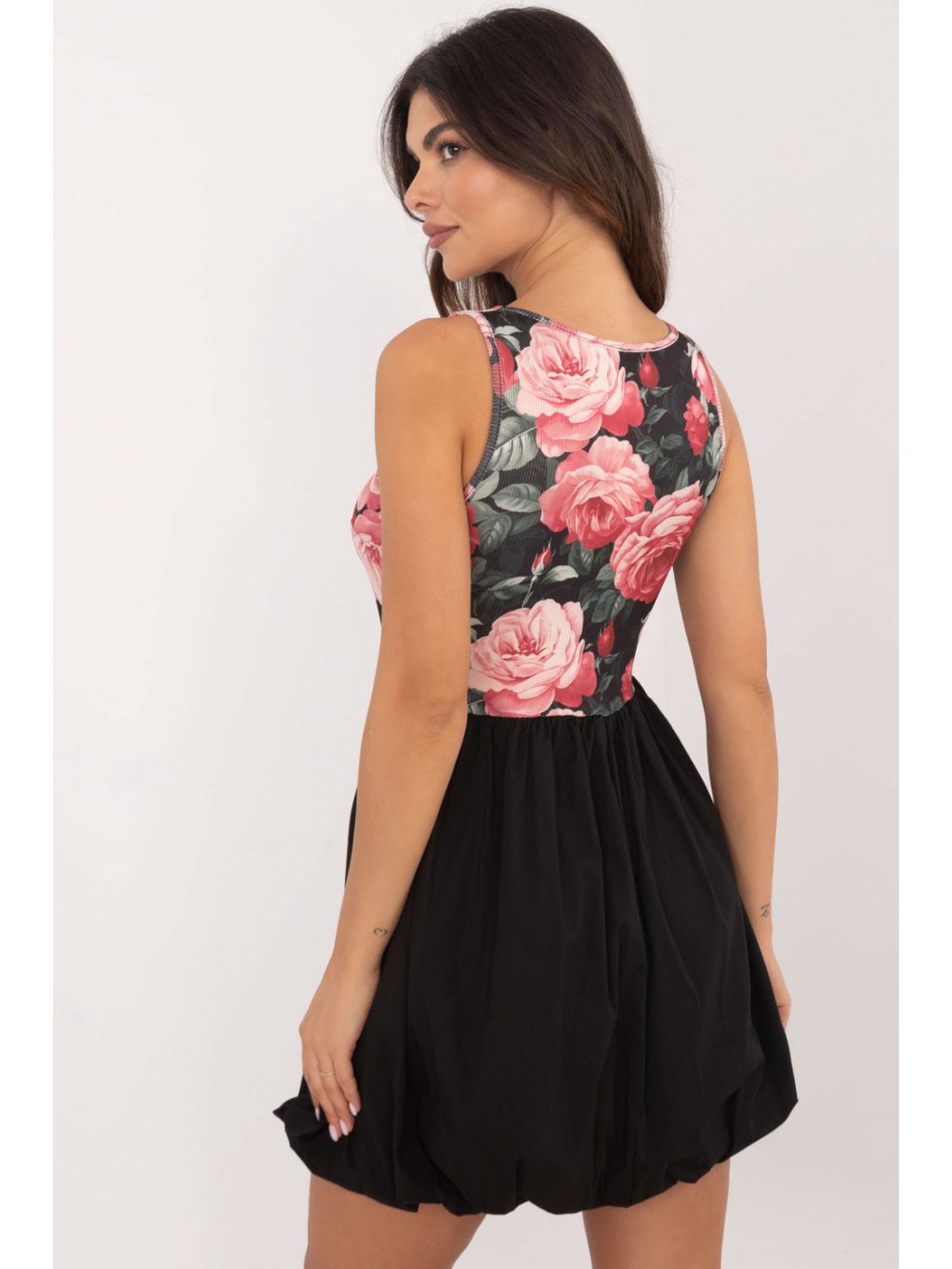 Tyto mini šaty jsou ideální volbou pro každodenní nošení a kombinují pohodlí a módní vzhled. Jsou vyrobeny ze směsi viskózy a polyesteru, takže jsou lehké a pohodlné, zatímco všitá podšívka dodává pohodlí a skvěle se v nich cítí. Horní část šatů zdobí jemný květinový potisk, zatímco spodní část je ponechána v jednolité, klasické černé barvě pro stylový kontrast. Šaty mají kulatý výstřih a ramínka, která zdůrazňují lehkost střihu. Všité košíčky poskytují dodatečnou oporu a díky absenci zapínání se šaty snadno nosí.